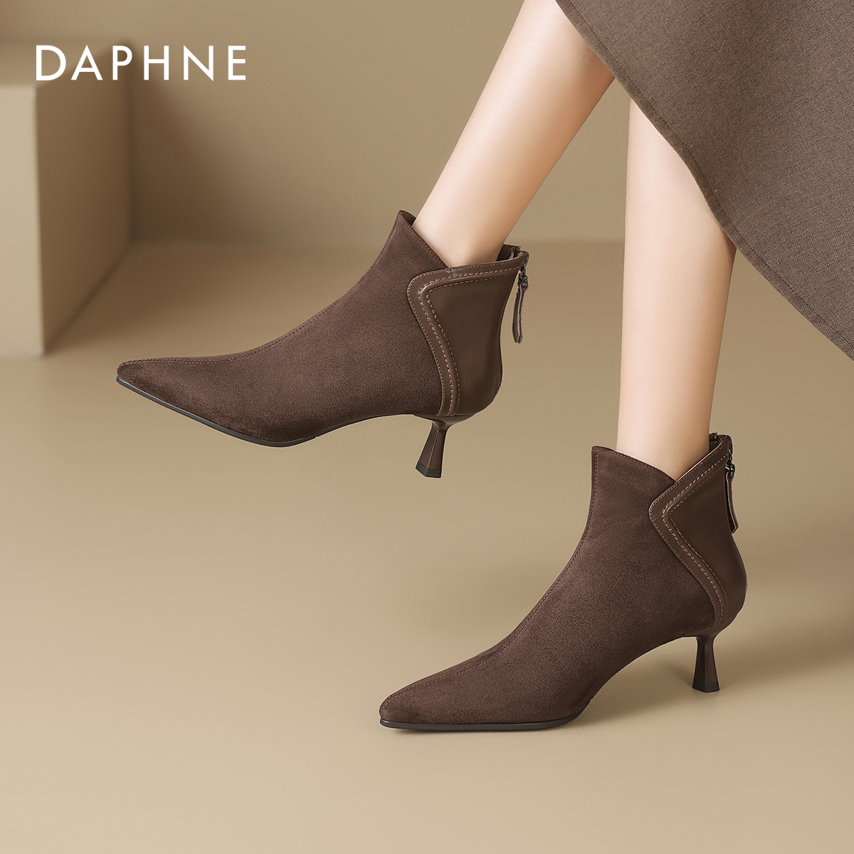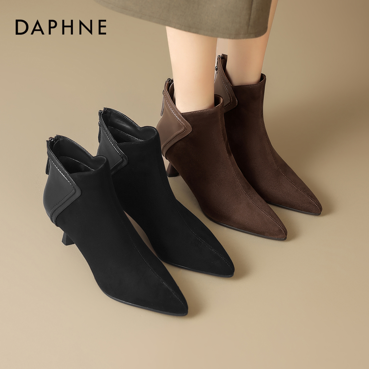 达芙妮尖头短靴女2025新款秋冬季加绒小踝靴细高跟靴子复古妈妈鞋
