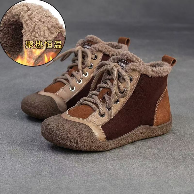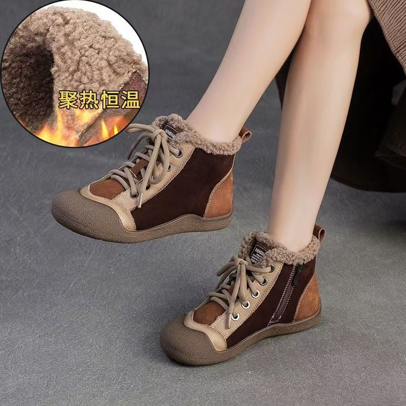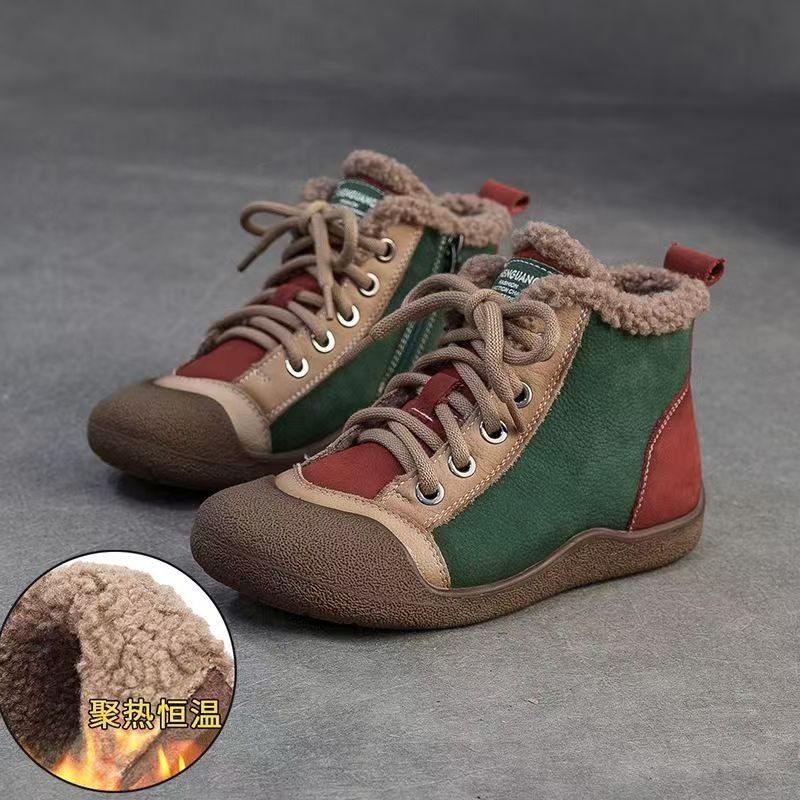 复古真皮加绒马丁靴女2025冬季新款休闲拼色高帮鞋侧拉链厚底短靴