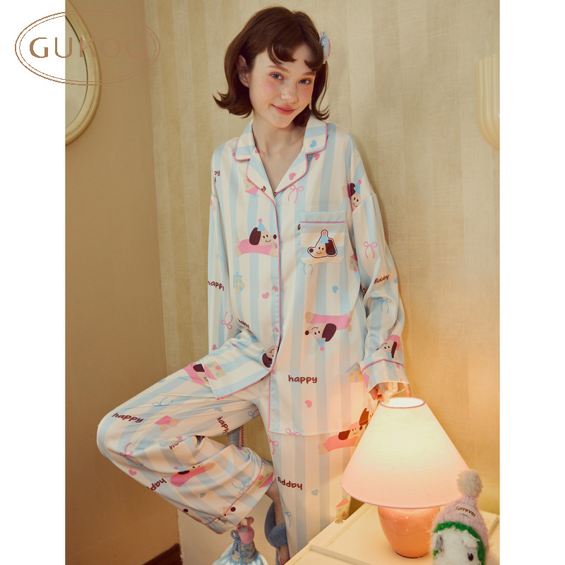 Gukoo/果壳睡衣女夏款轰轰小狗系列冰丝质感家居服套装