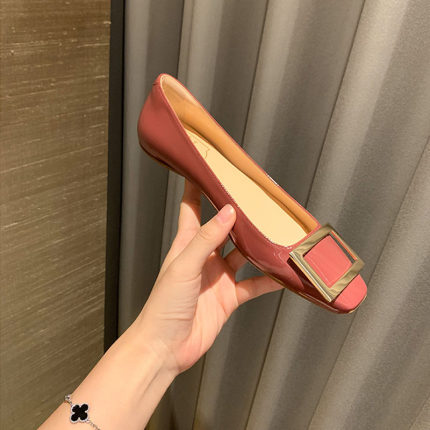 25新款金属方扣平底单鞋女小香风复古漆皮婚鞋浅口软底方头平底鞋
