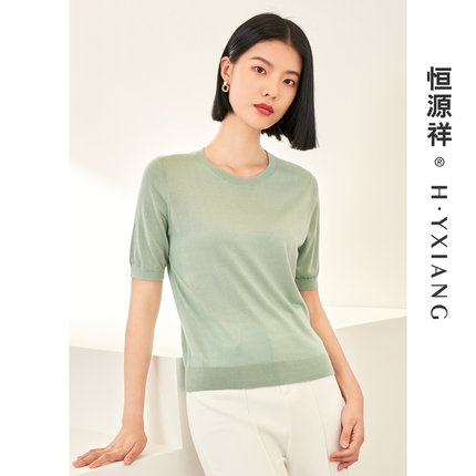 Q恒源祥简约圆领短袖针织T恤衫女春夏新款糖果色桑蚕丝上衣ins