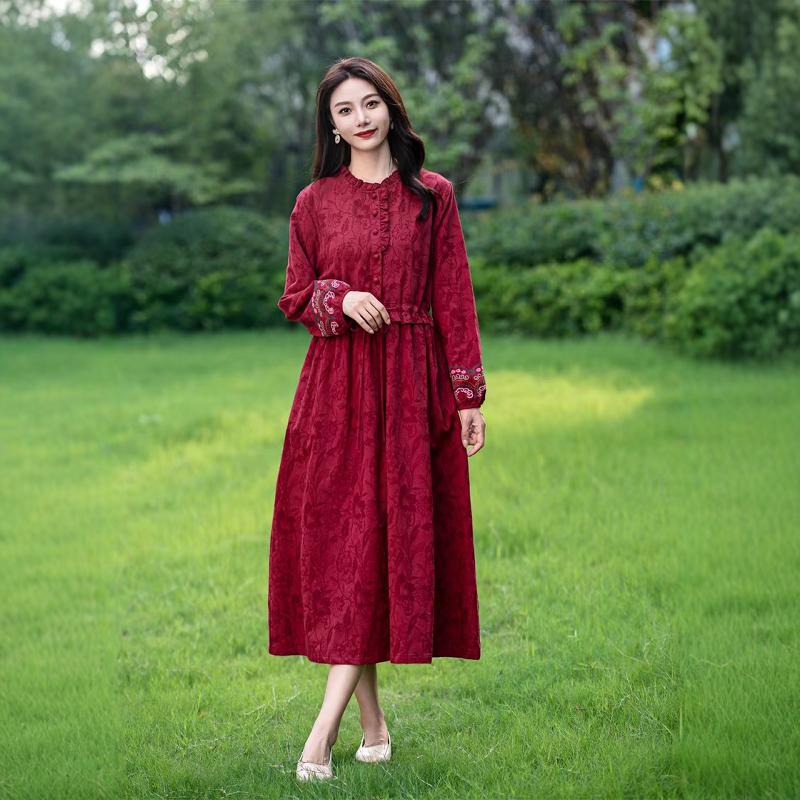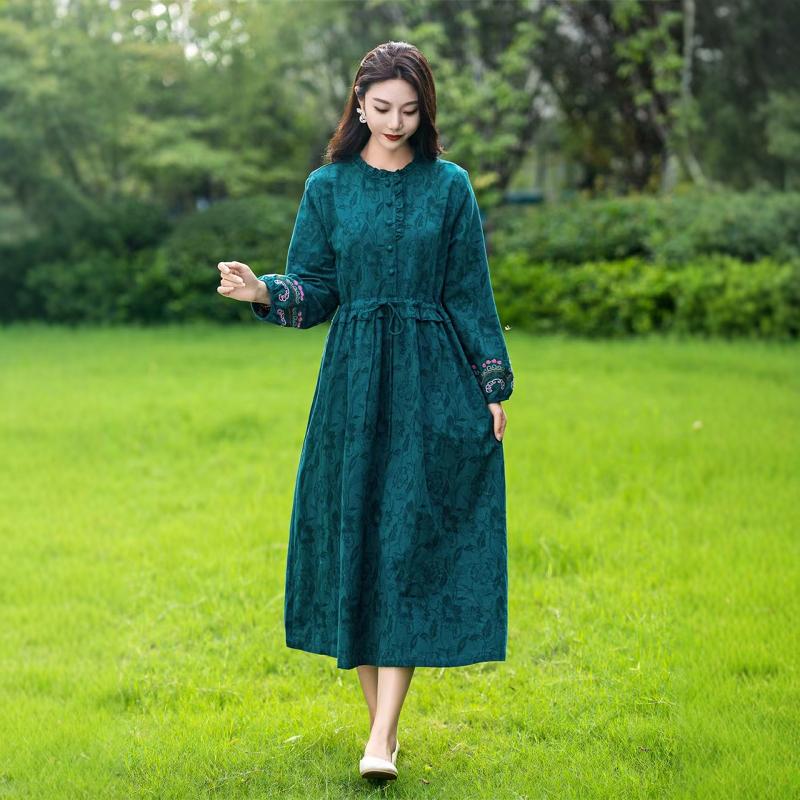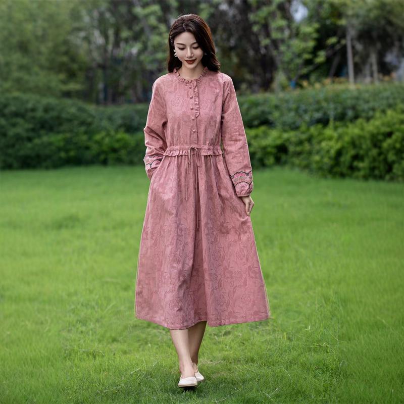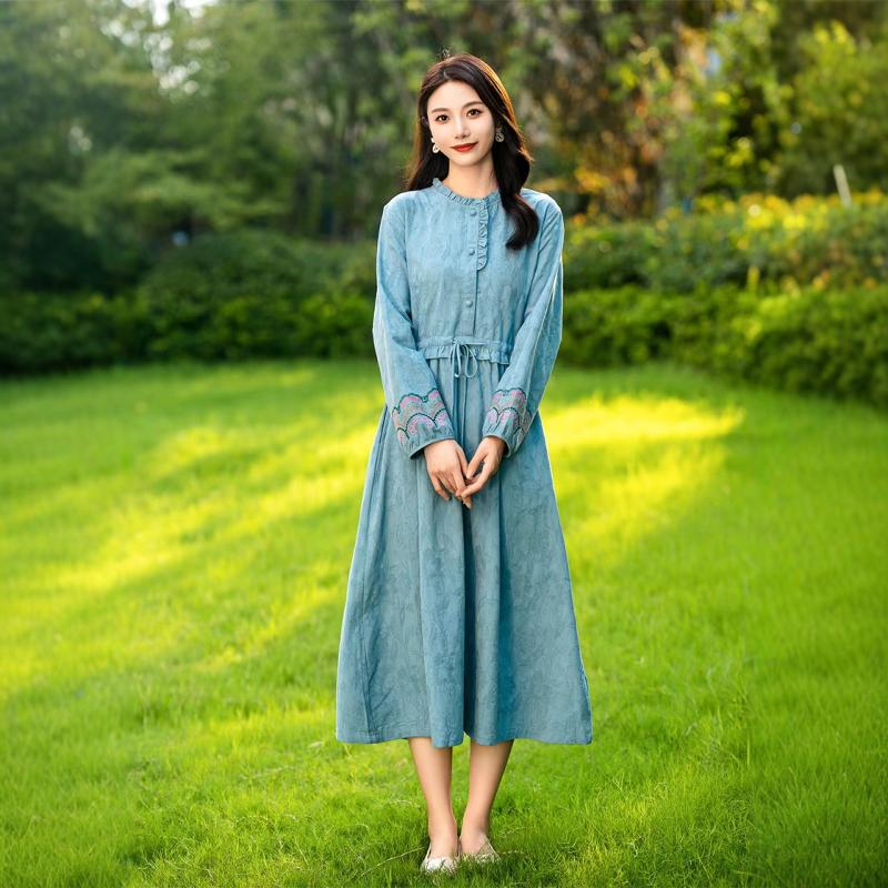 秋装新复古民族刺绣棉麻提花系带连衣裙女宽松显瘦拼花边领A字裙