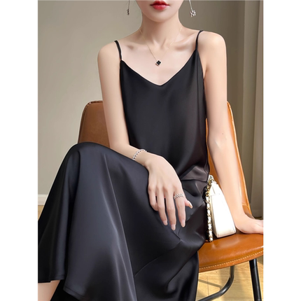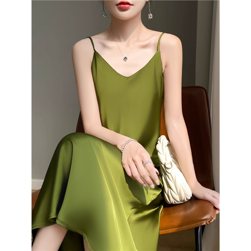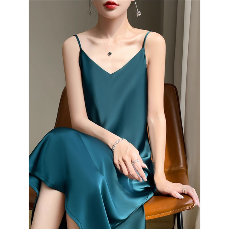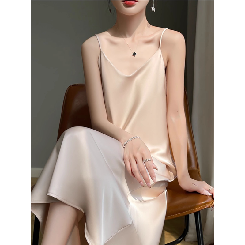 高级感醋酸缎面长裙真丝吊带裙子V领西装打底裙夏季光泽感连衣裙