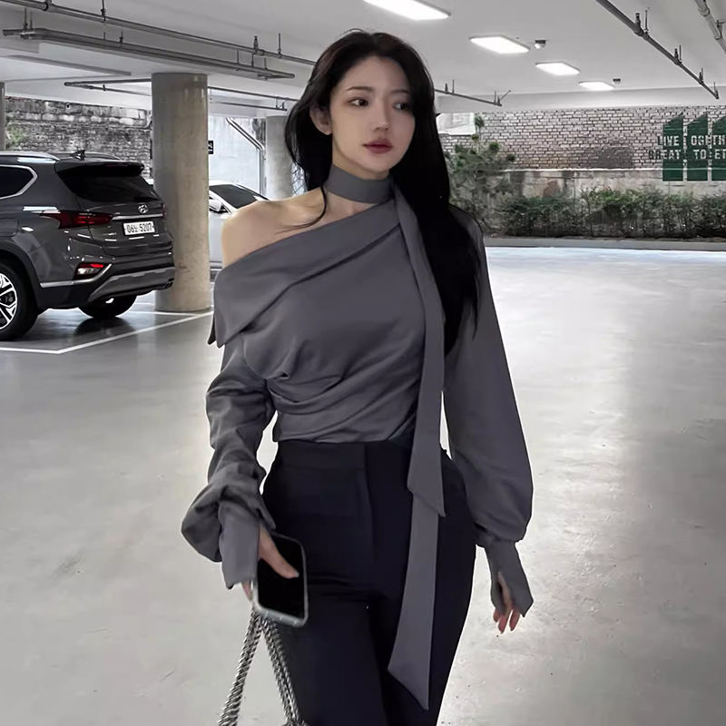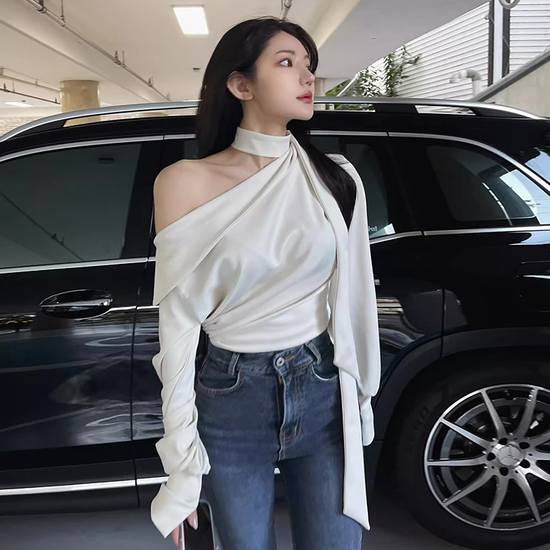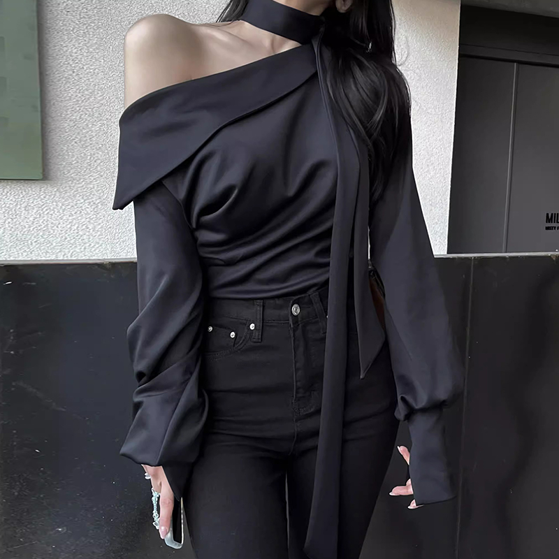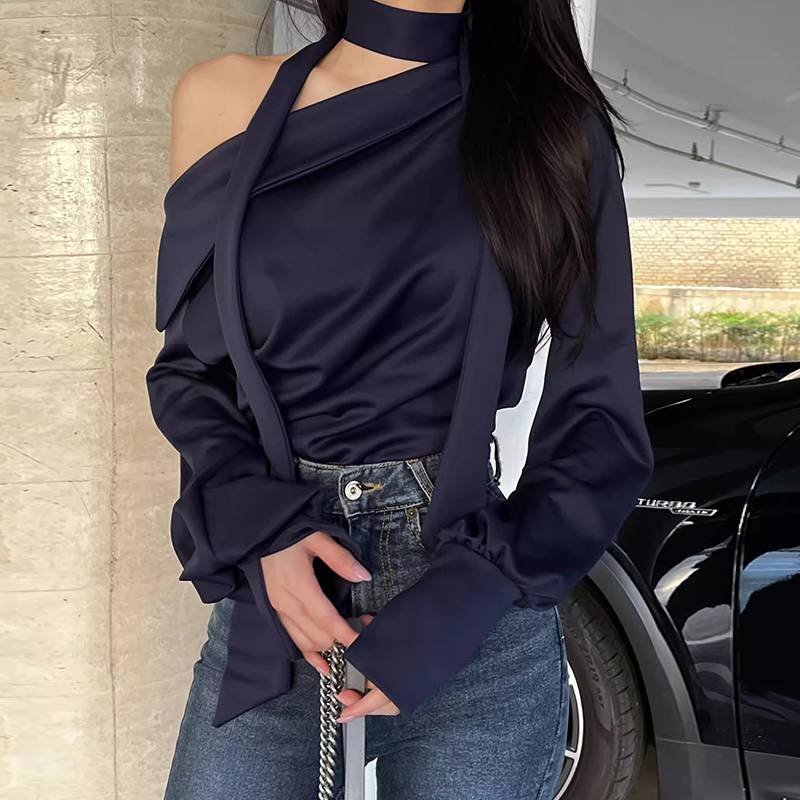 韩国chic秋季法式气质不规则斜领飘带设计褶皱露肩长袖绸面衬衫女
