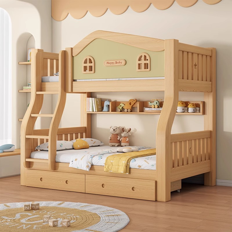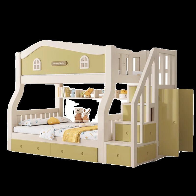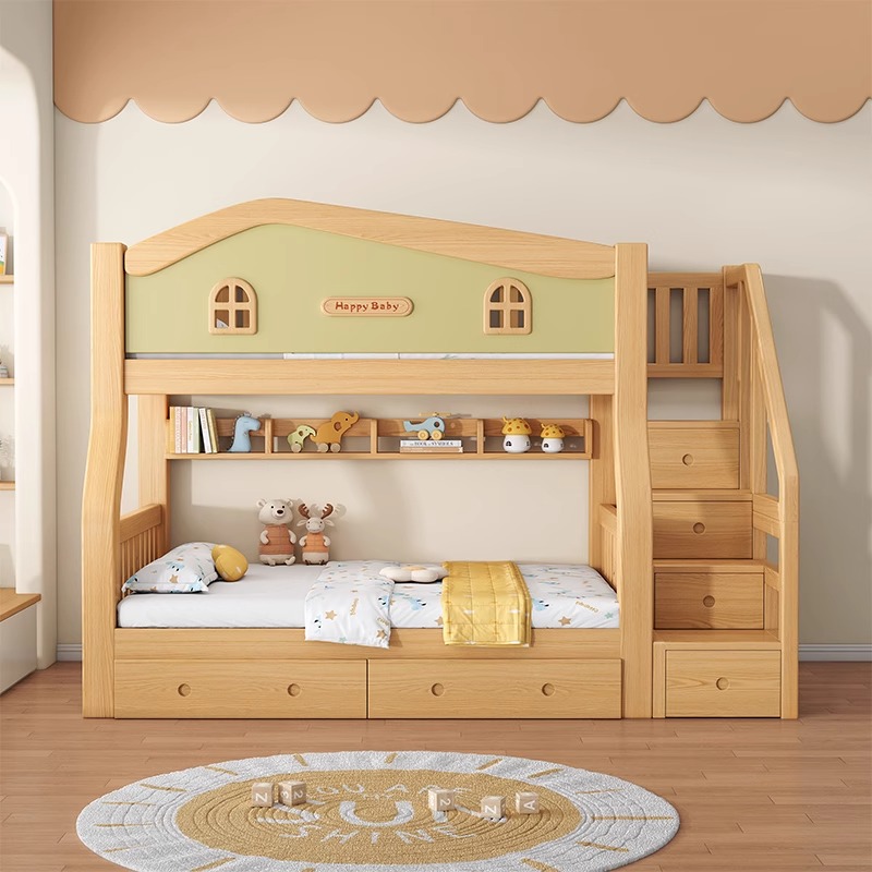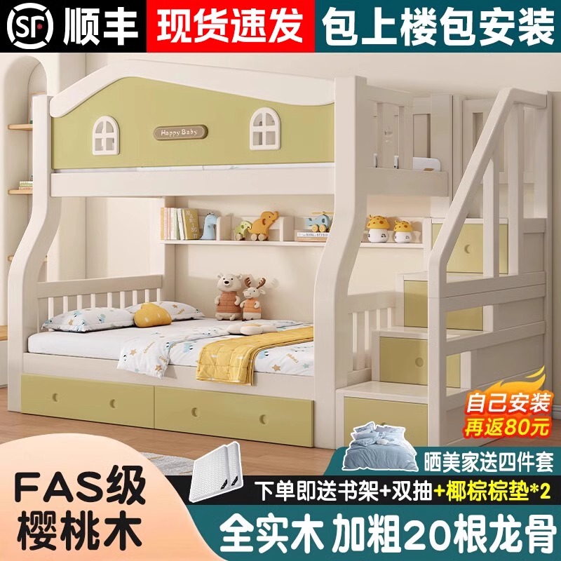 上下铺双层床奶油风小户型全实木儿童子母床姐弟双人高低床上下床