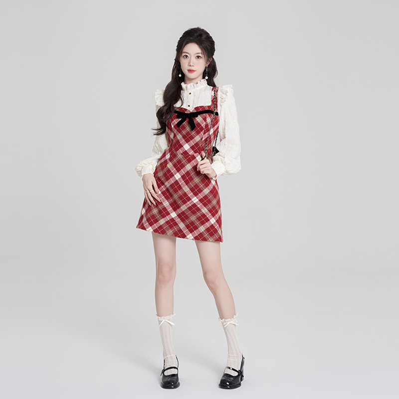 复古法式红色格子背带连衣裙女春秋2025年新款小个子甜美新年战袍