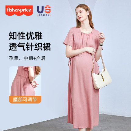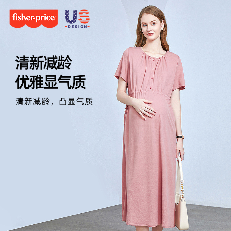 费雪孕妇装夏季连衣裙子2025新款宽松短袖纯色法式中长款时尚夏装