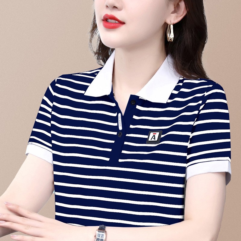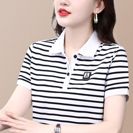 黑白条纹短袖t恤女纯翻领棉夏装中年妈妈有领polo衫带领运动上衣