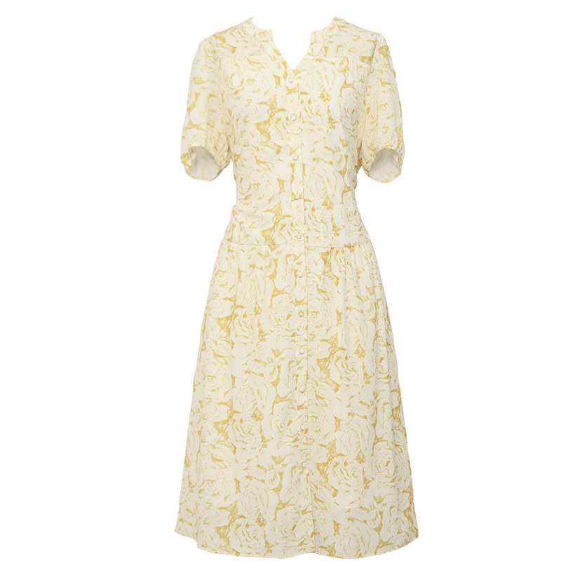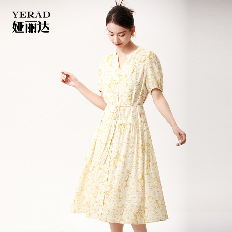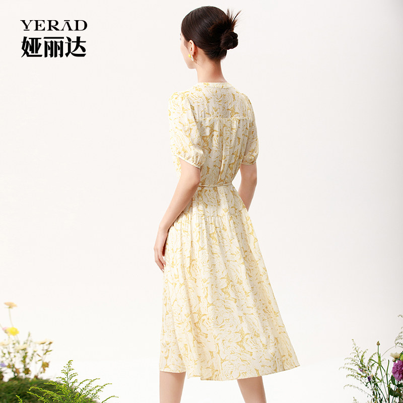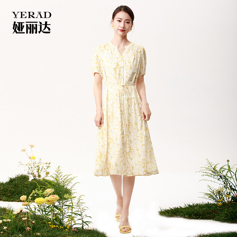 娅丽达商场同款法式连衣裙女2025夏季新款温柔风气质黄色碎花长裙
