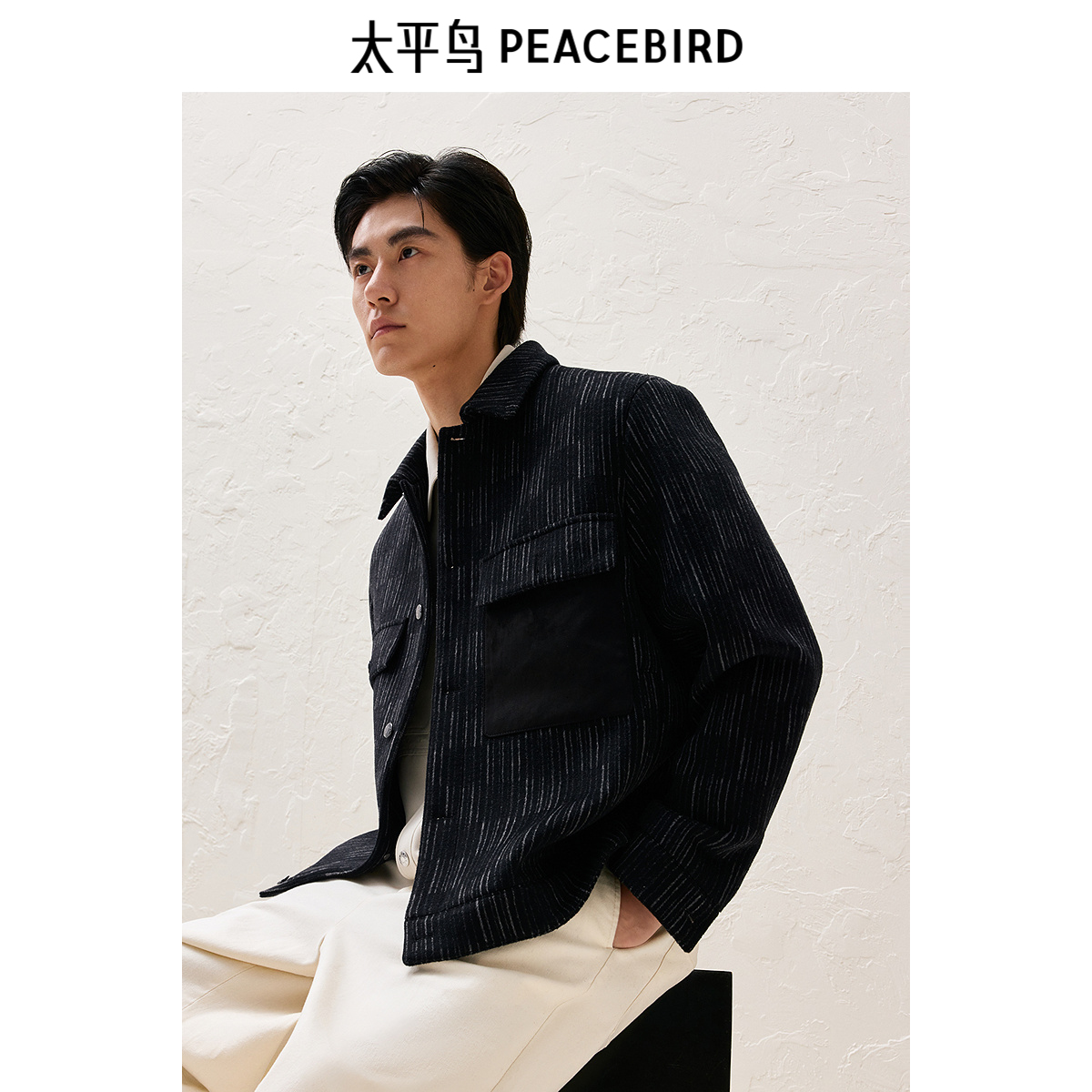 太平鸟男装格纹羊毛夹克冬款拼接双面呢外套休闲行政茄克青年