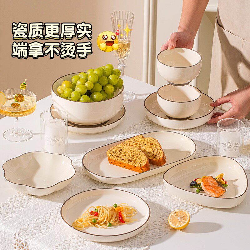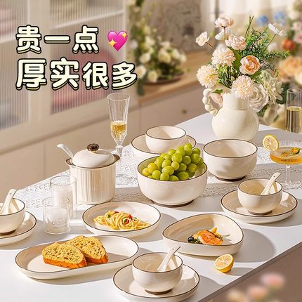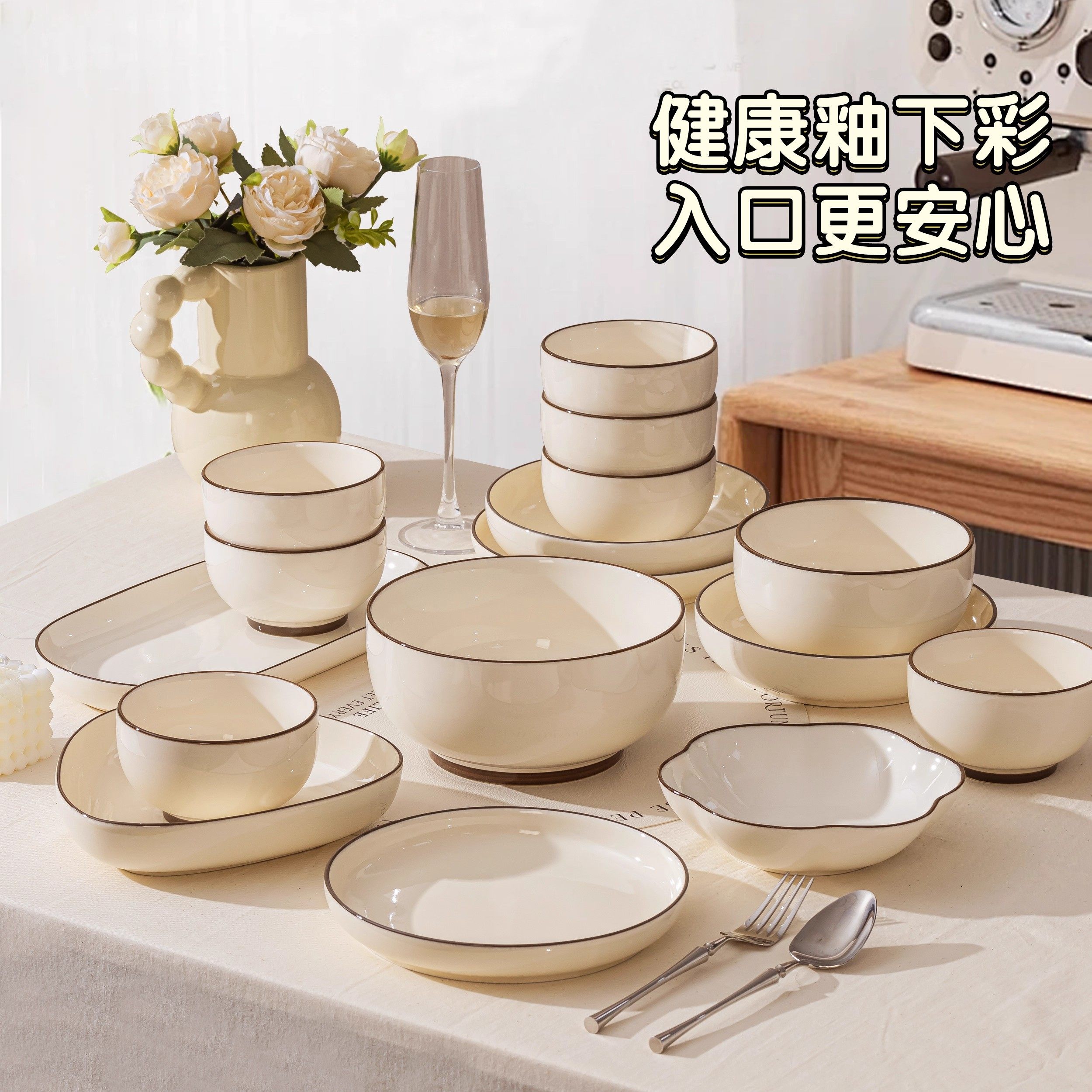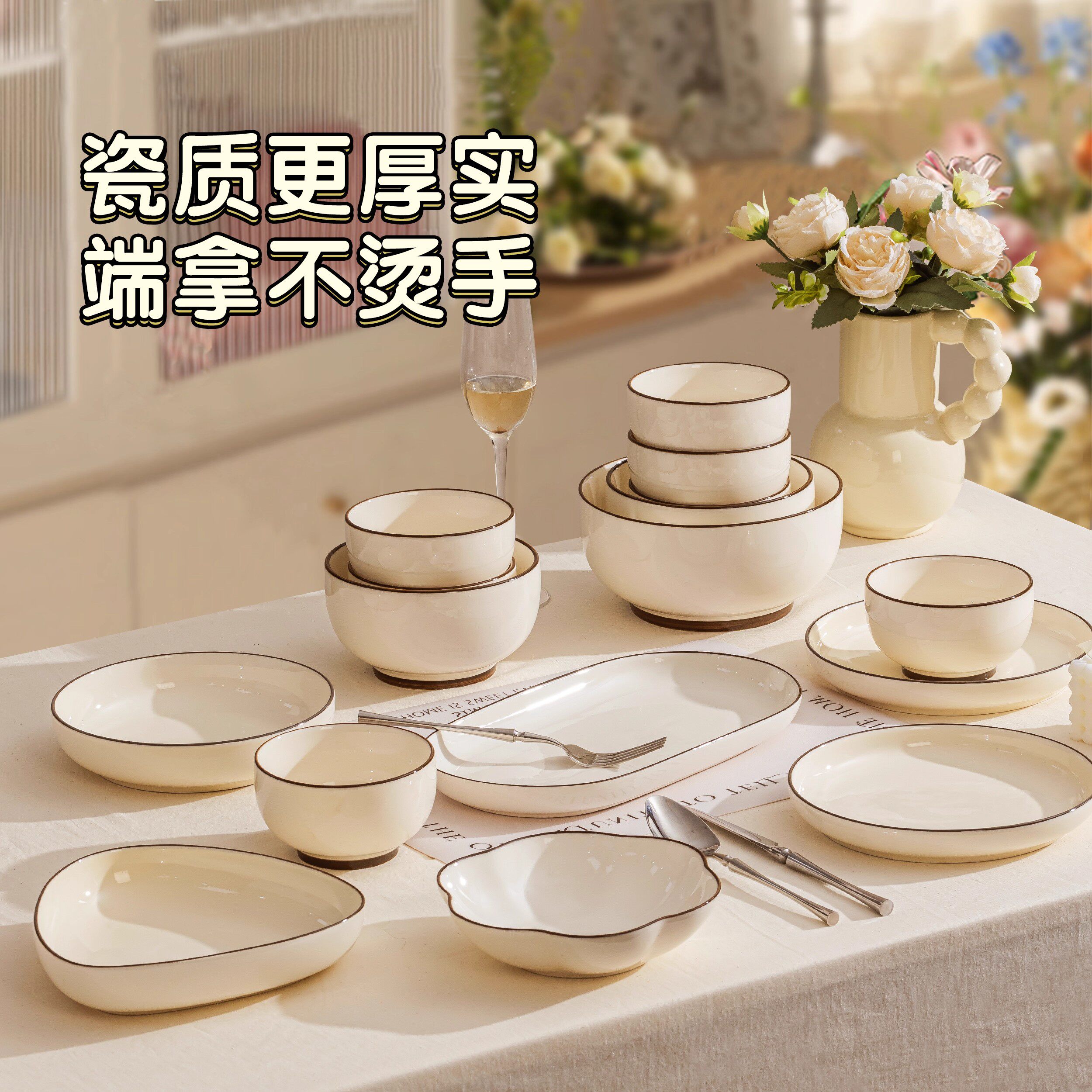 景德镇碗碟家用新款陶瓷碗盘筷乔迁简约玉白描棕餐具套装无礼盒