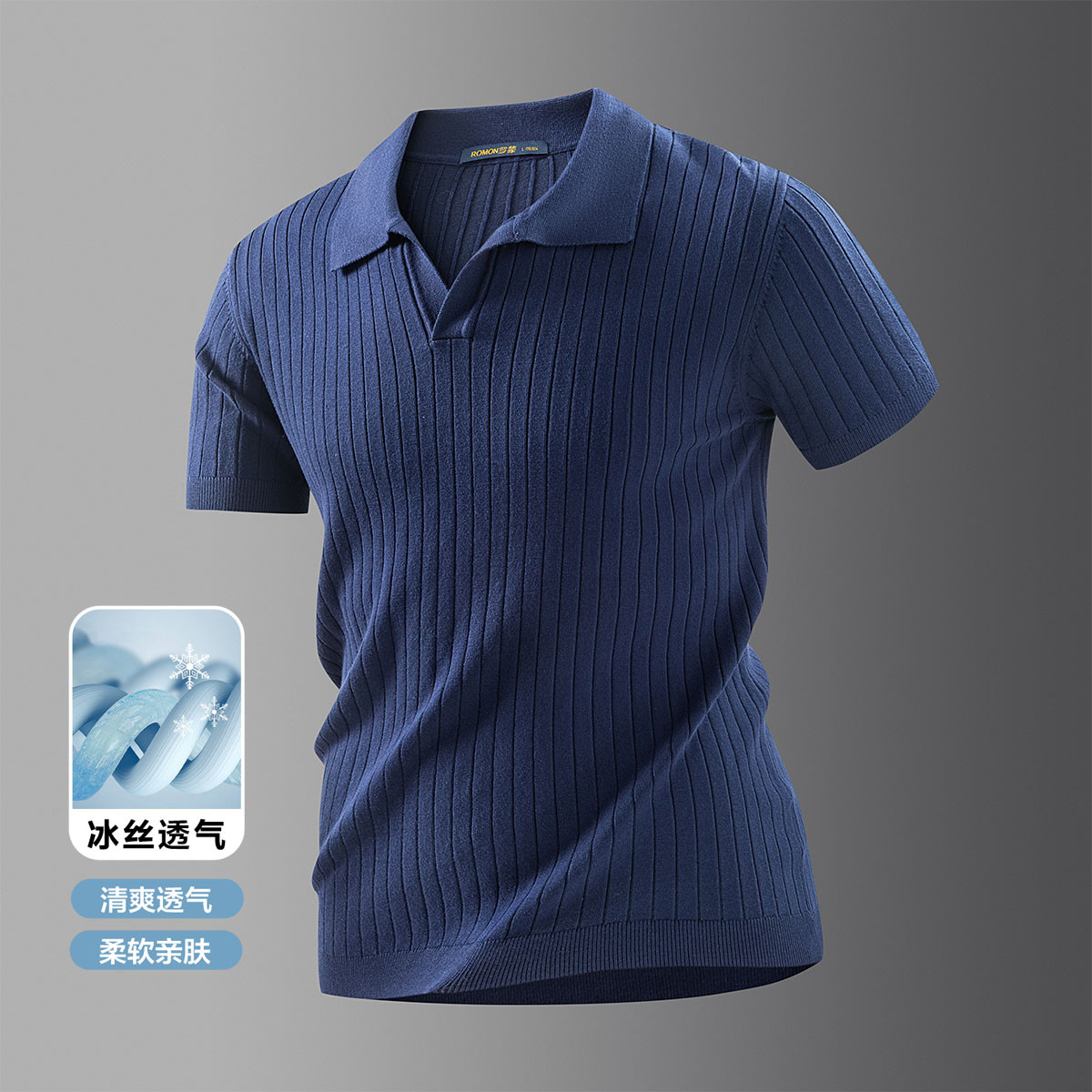 罗蒙针织短袖polo衫冰丝夏新中式纯色亨利领商务休闲小V领男士T恤