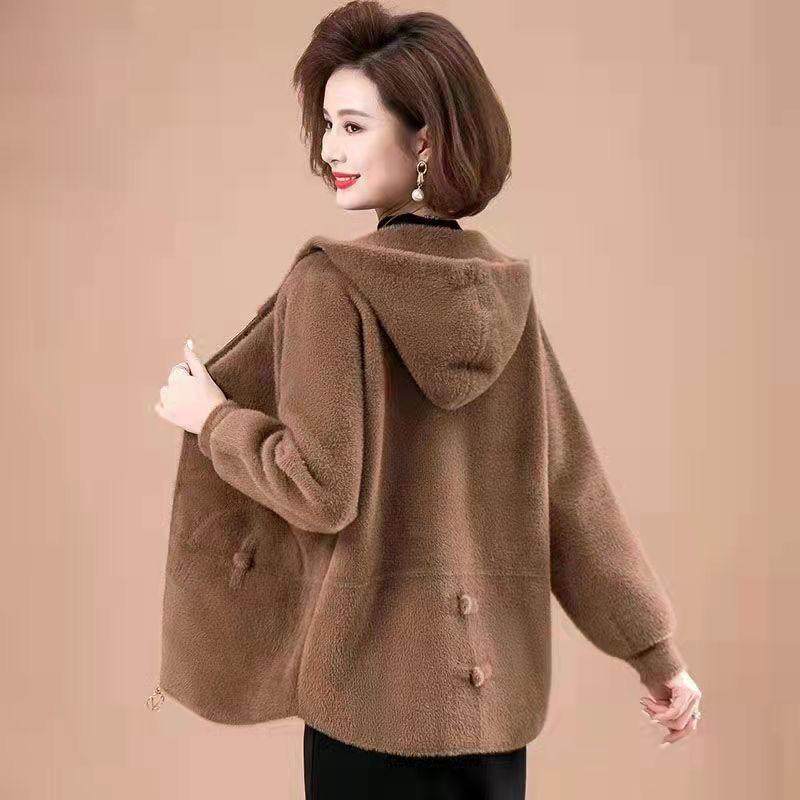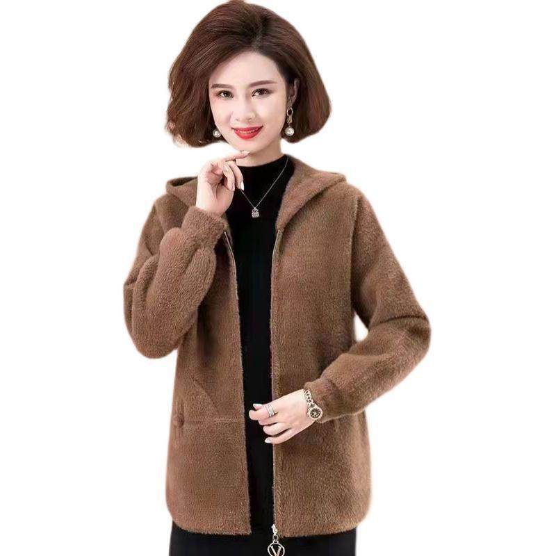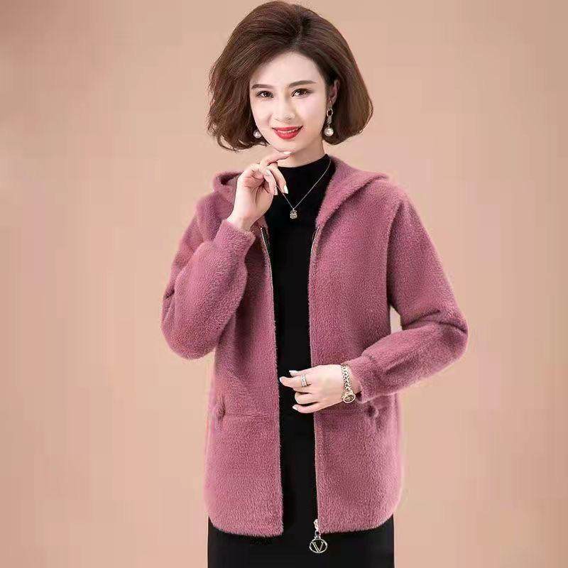 妈妈装秋冬加厚水貂绒连帽外套女短款上衣中老年高贵洋气拉链开衫