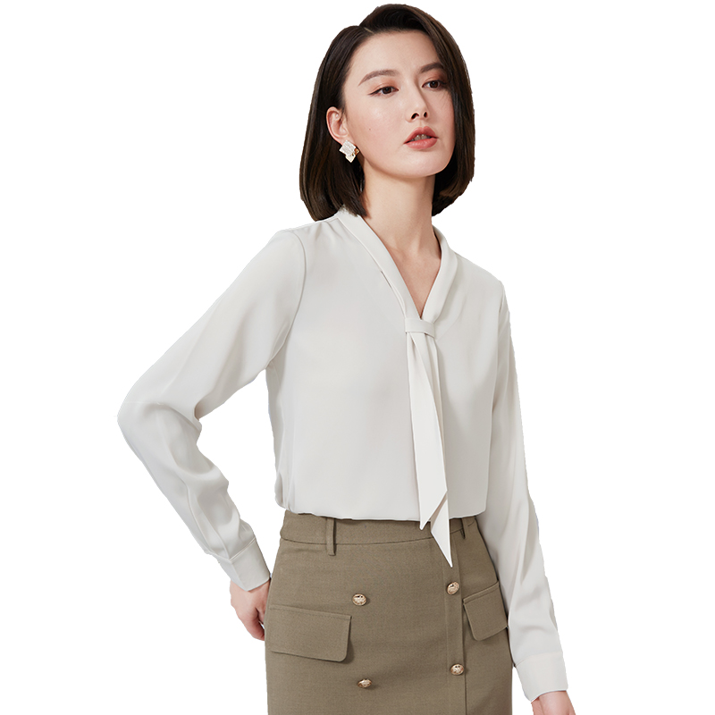 璐丝百丽米杏色v领飘带雪纺衫女长袖春职业衬衫洋气小衫高贵上衣