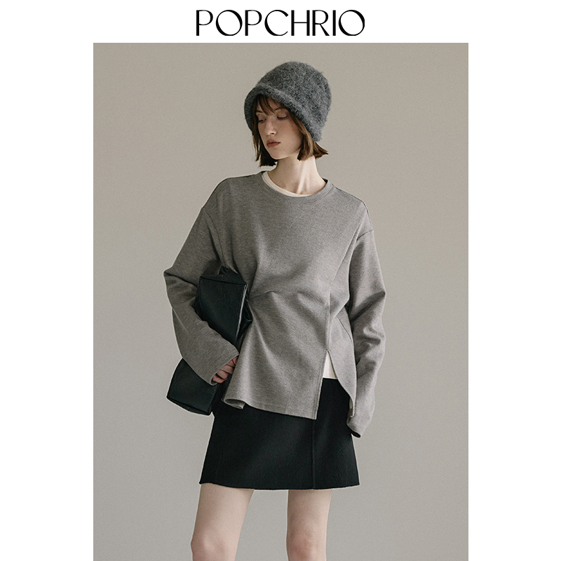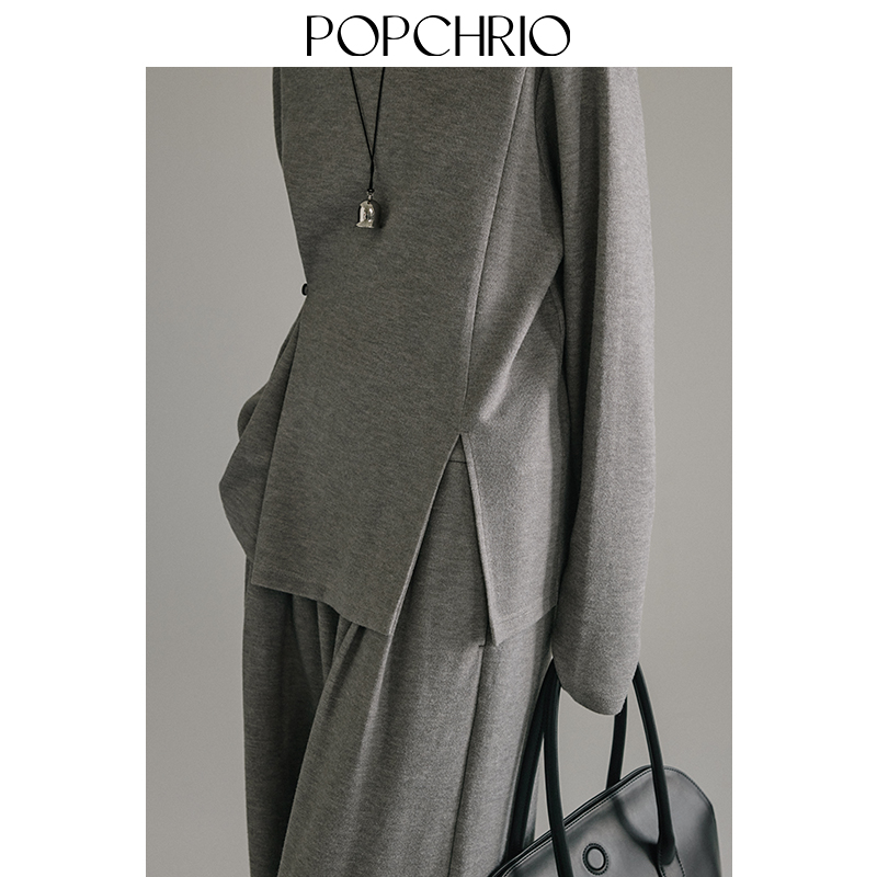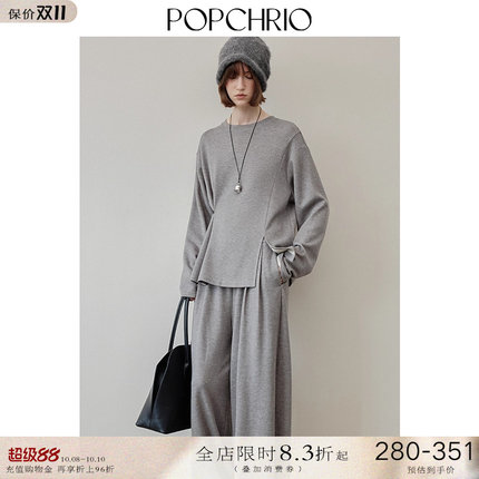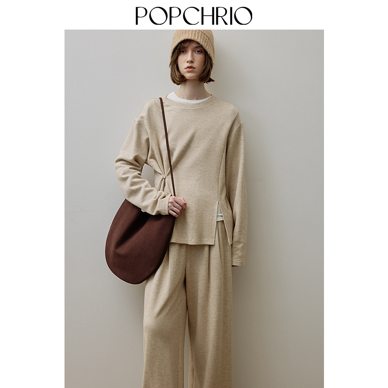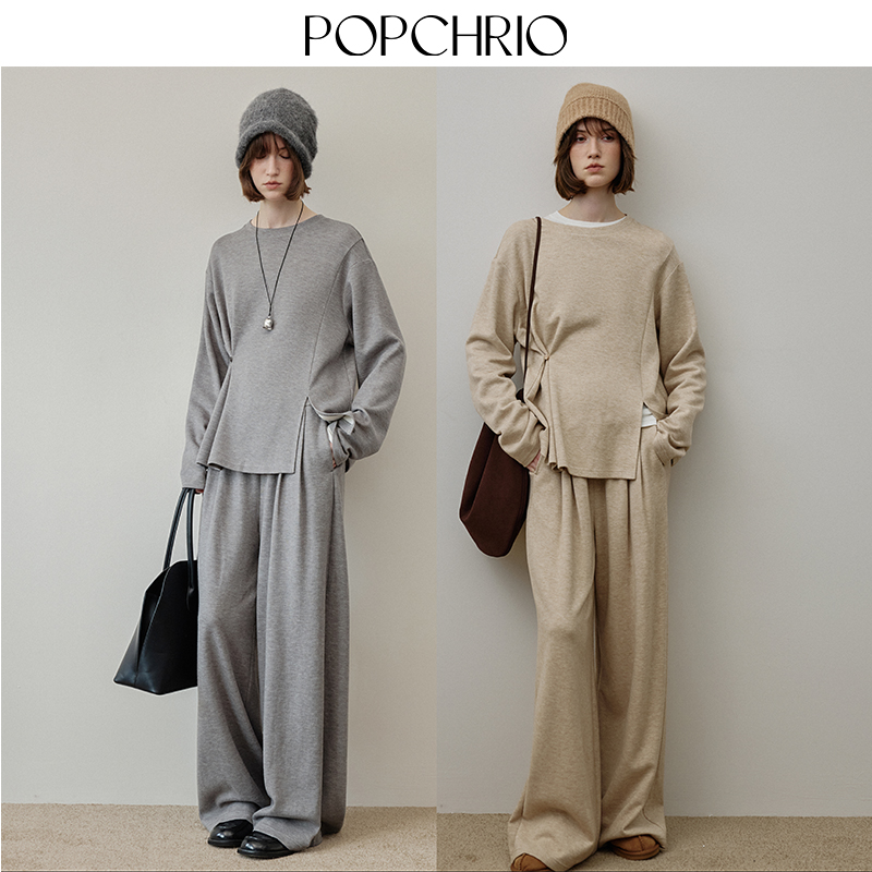 POPCHRIO欧可芮◆设计感针织T恤衫松紧高腰套装阔腿拖地休闲裤女