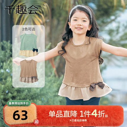 千趣会童装幼儿园宝宝夏季短袖T恤雪纺拼接蝴蝶结女童棉质上衣