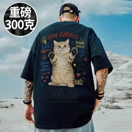 100%纯棉300g重磅美式潮牌宽松情侣T恤短袖五分袖加肥加大码男装