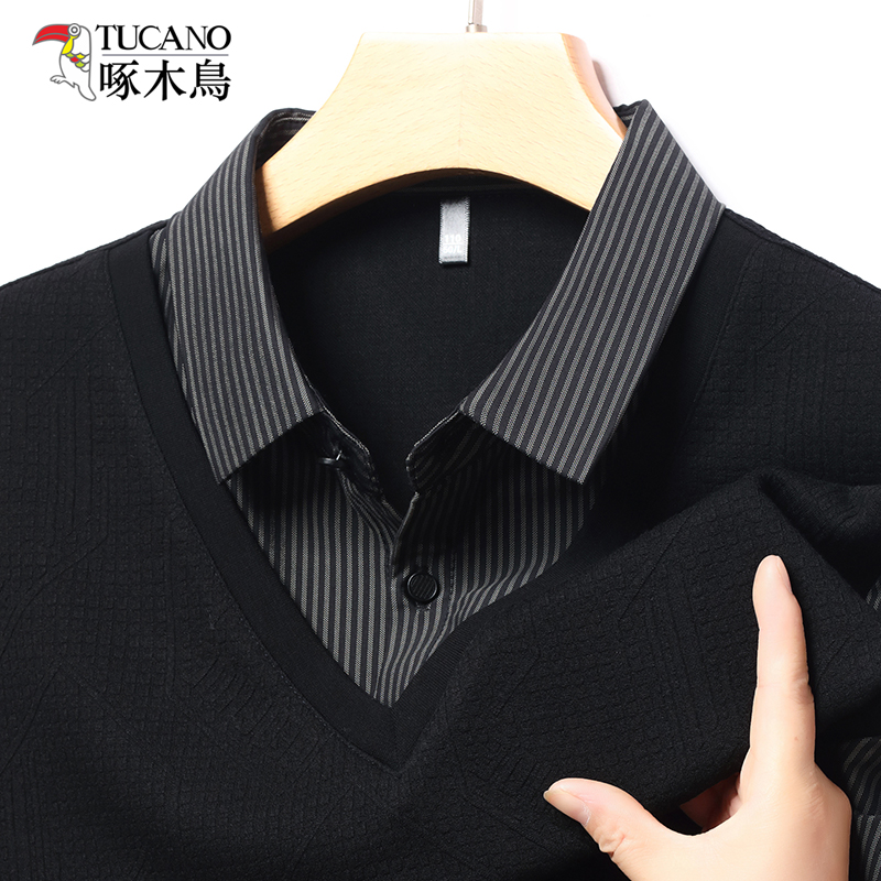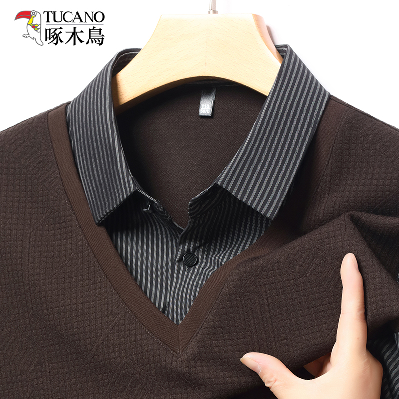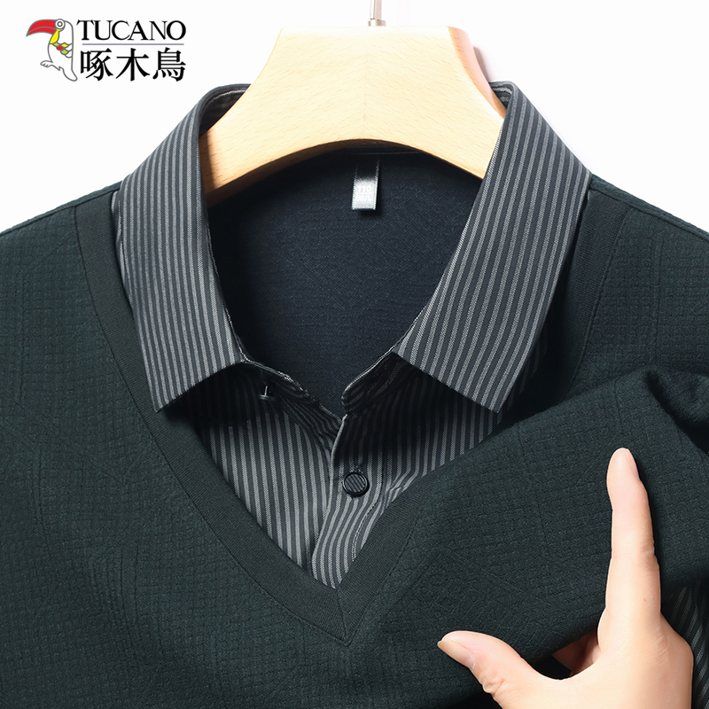 啄木鸟男士假两件衬衫领T恤春秋季中老年男士商务休闲打底POLO衫