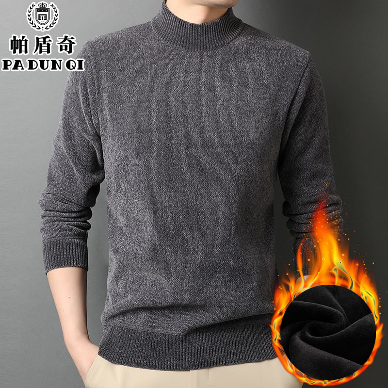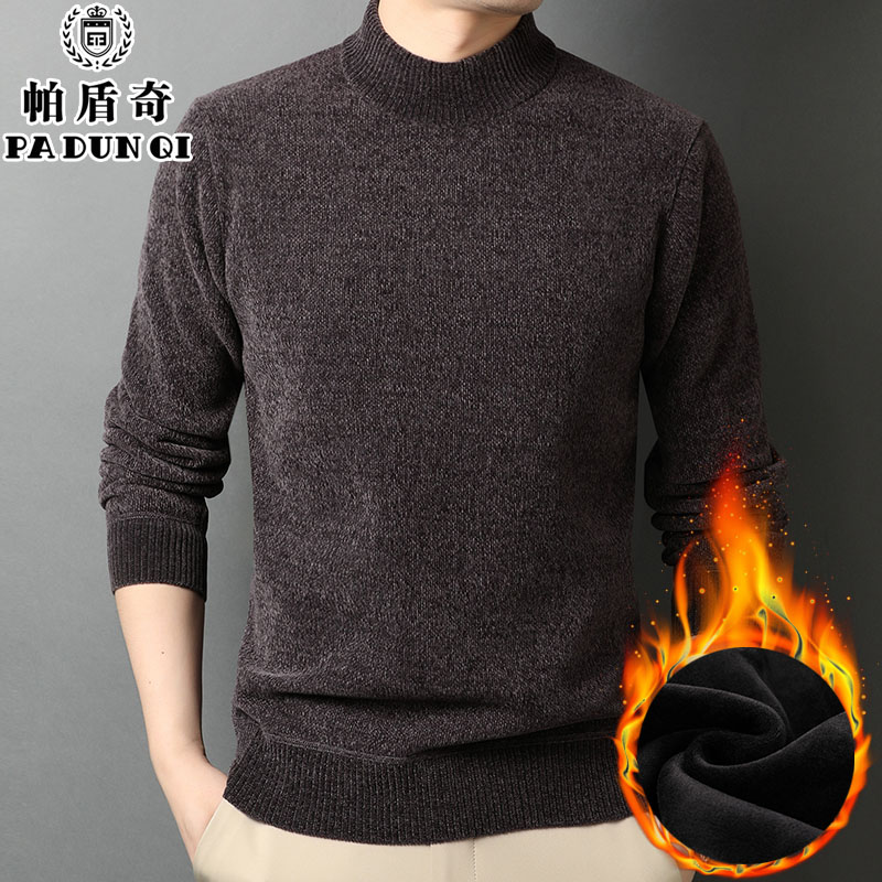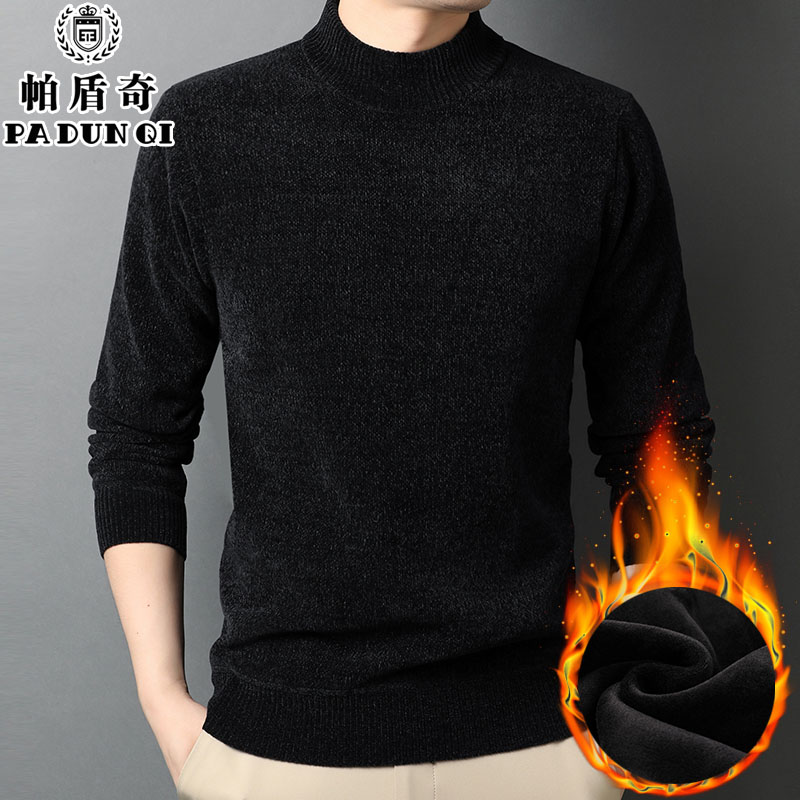 半高领雪尼尔毛衣男装一体加绒加厚中年保暖上衣中领针织打底衫潮