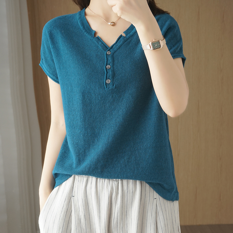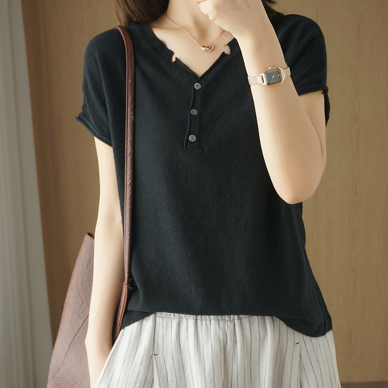 全棉麻针织短袖t恤女V领套头纯棉亚麻上衣背心宽松大码显瘦打底衫