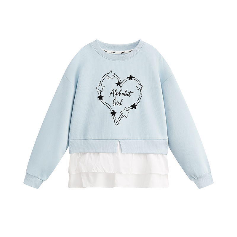 爱法贝25秋新款女童假两件卫衣宽松中大儿童装学生蕾丝拼接套头衫