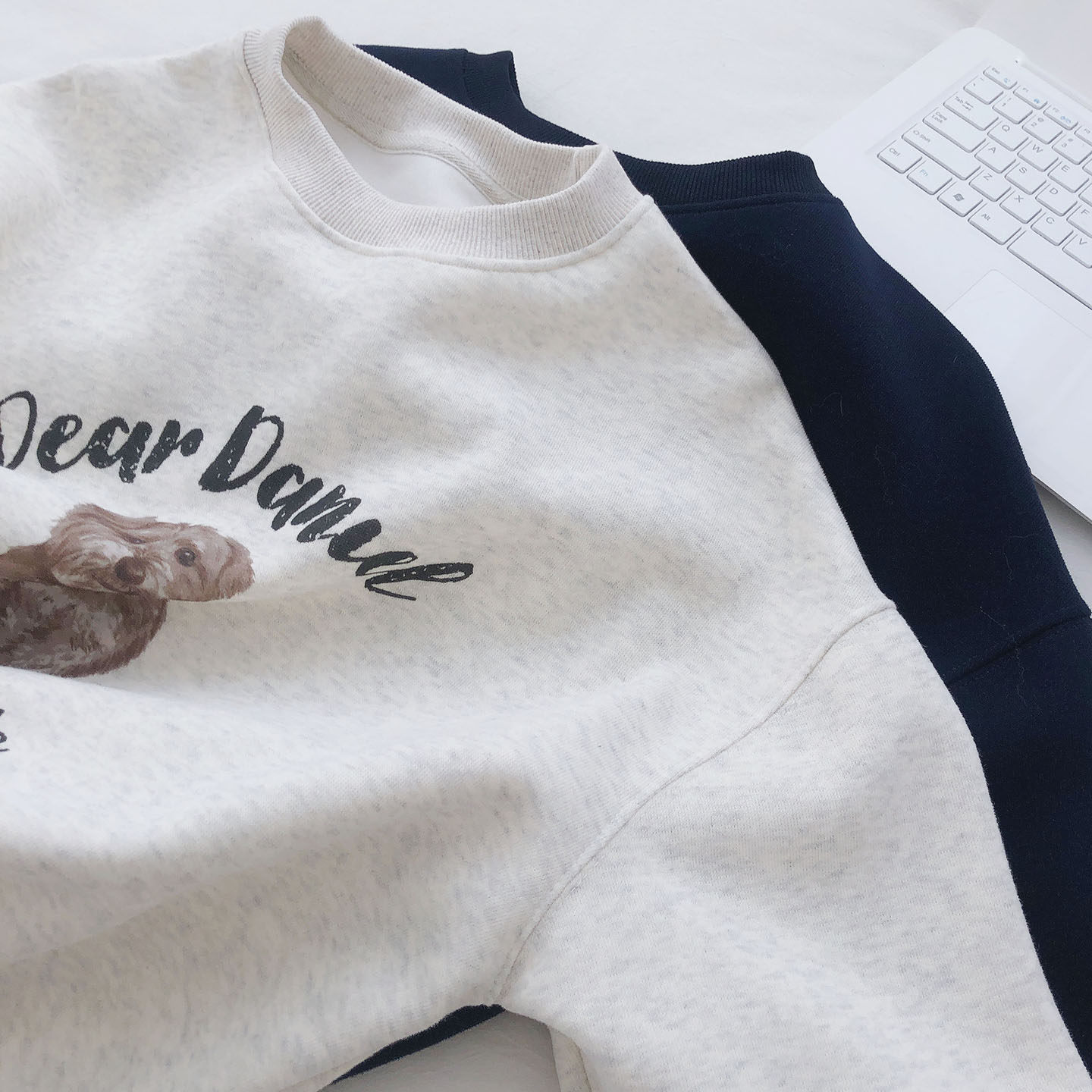 减龄/温柔米色小狗印花厚实卫衣女秋冬宽松圆领学生纯棉长袖上衣