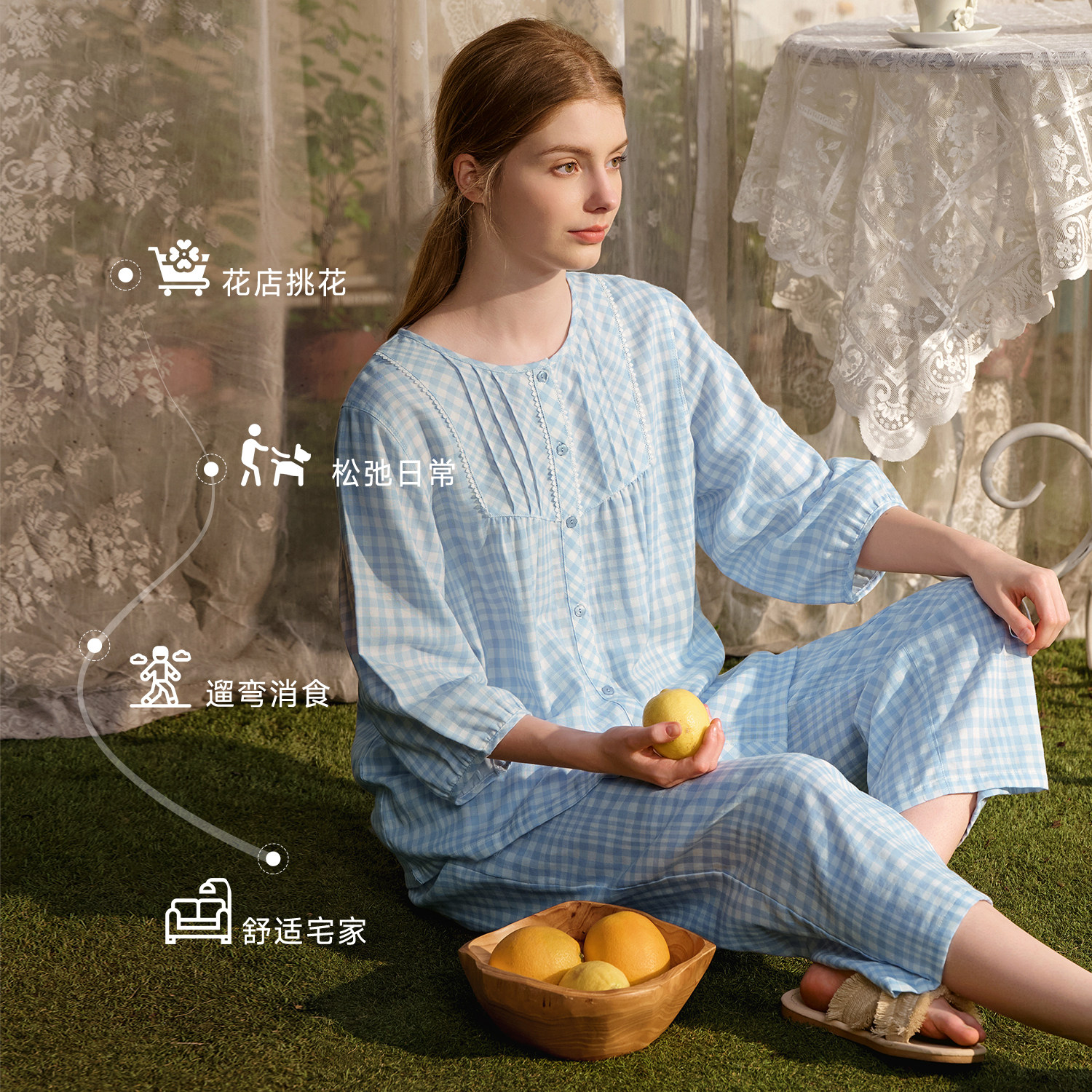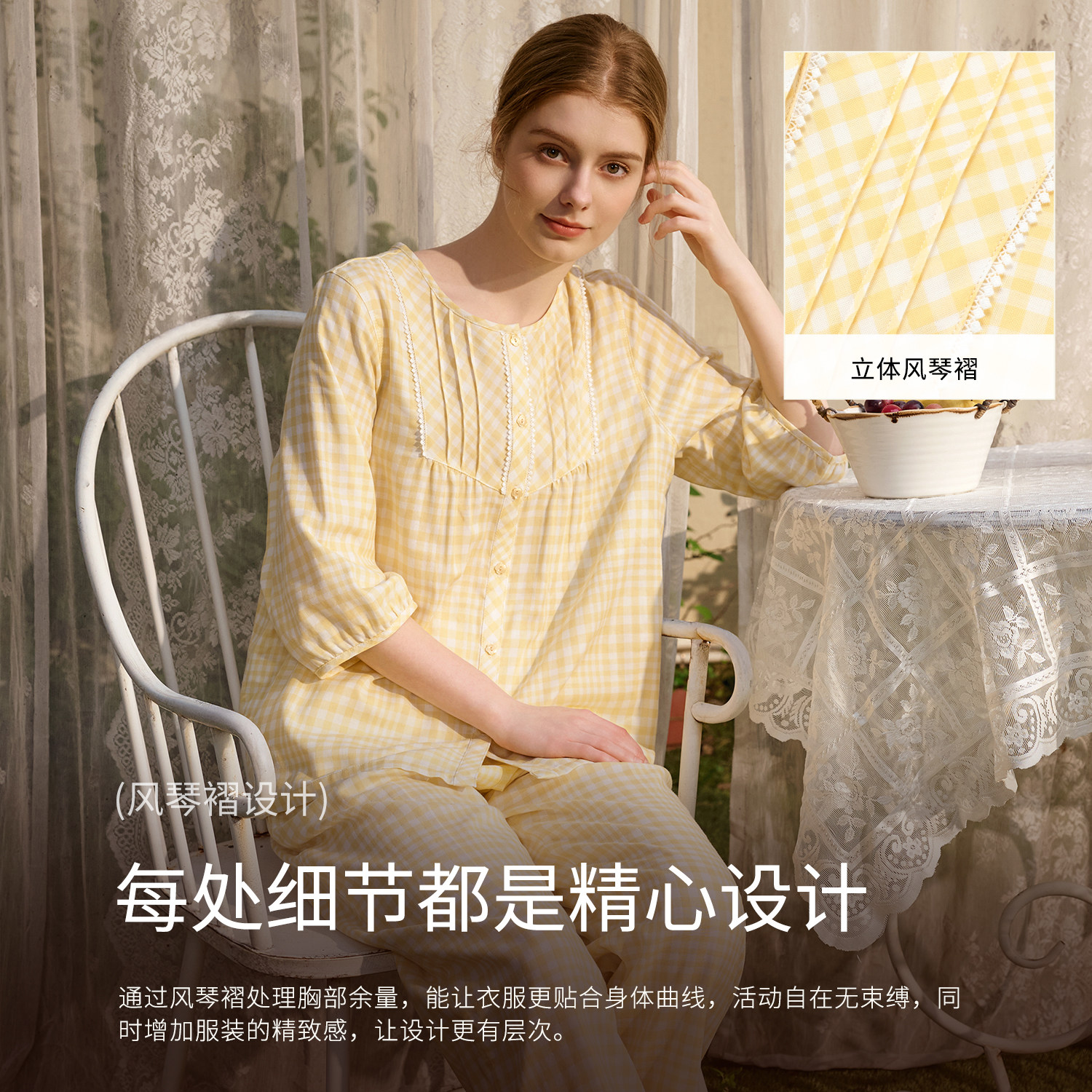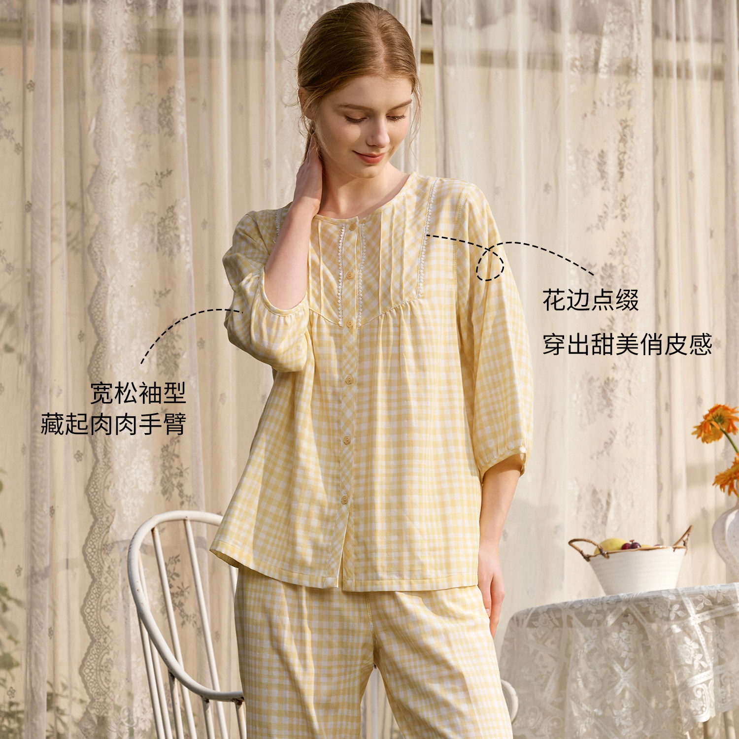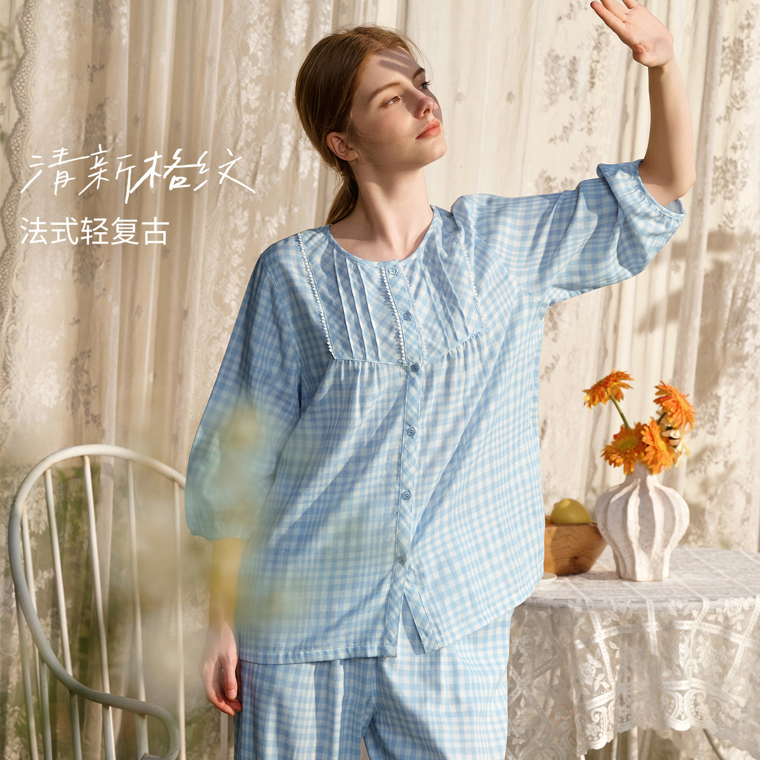 秋鹿纯棉睡衣女士法式格纹双层纱柔软花边绝美2026春夏新款家居服