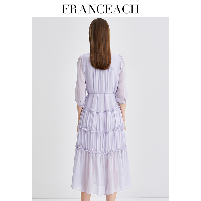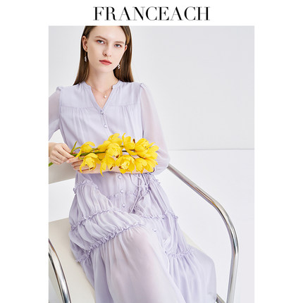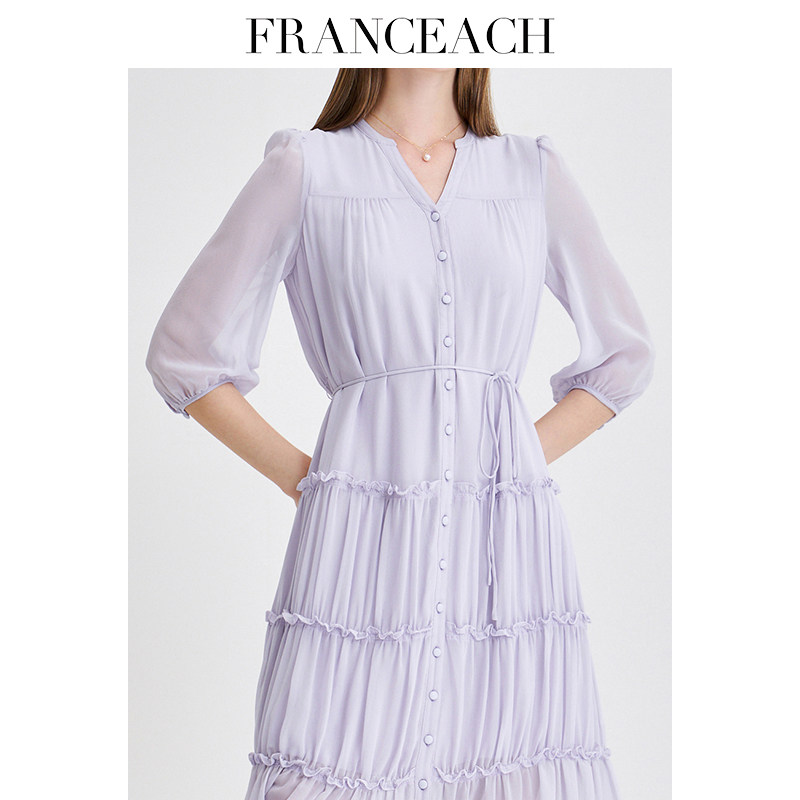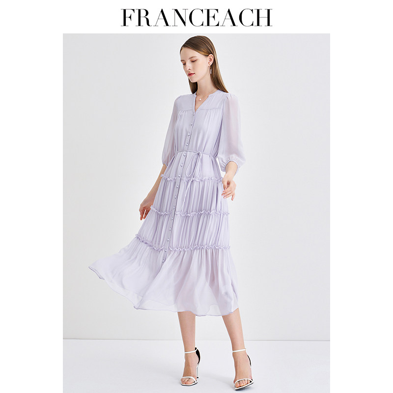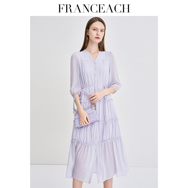 法涵意弛2024新款桑蚕丝连衣裙女法式V领气质木耳边真丝衬衫裙夏
