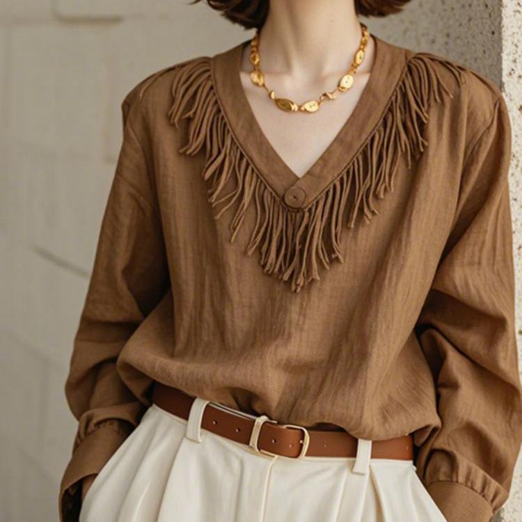 专柜撤回法式复古棕色流苏V领衬衫女宽松慵懒风冷淡系高级感上衣