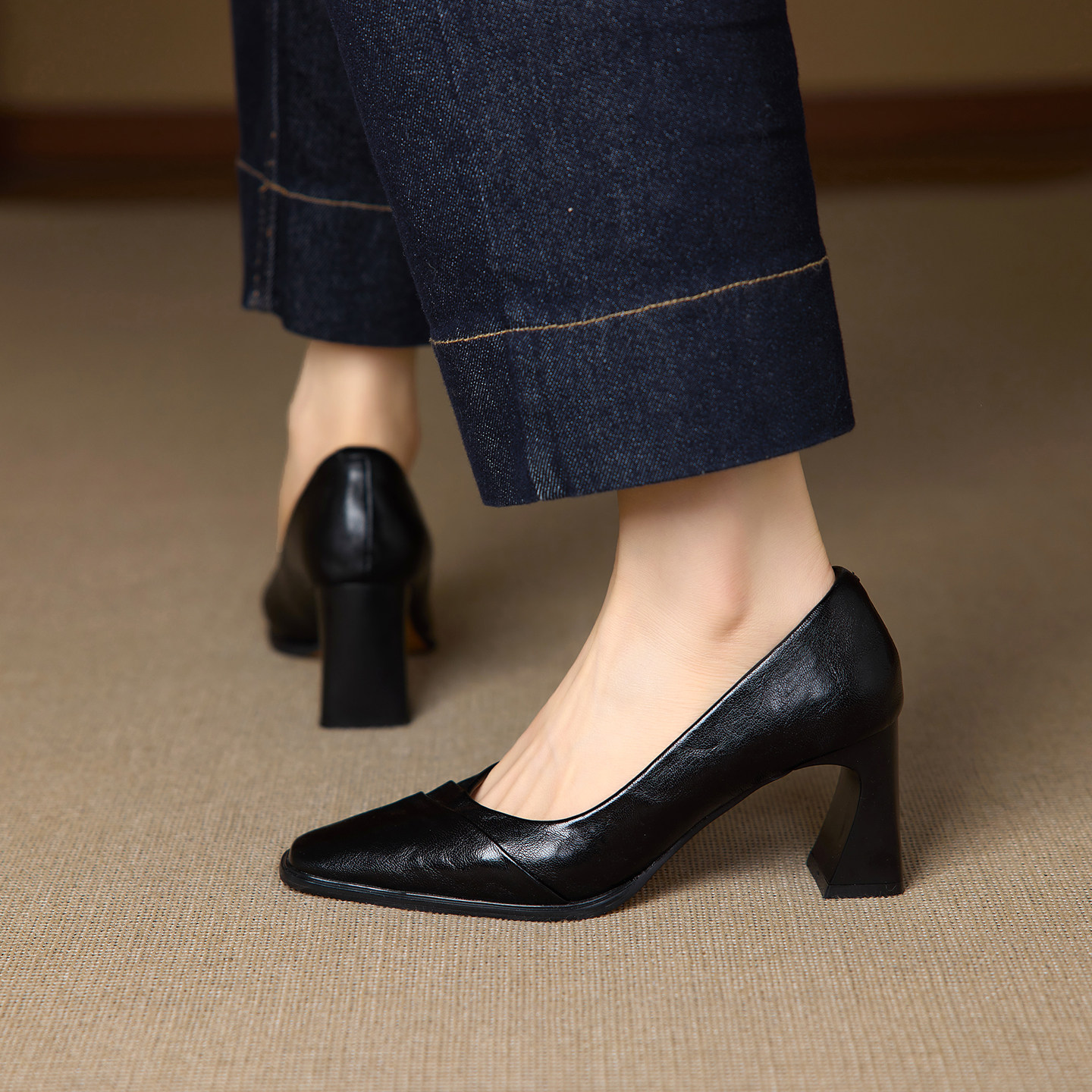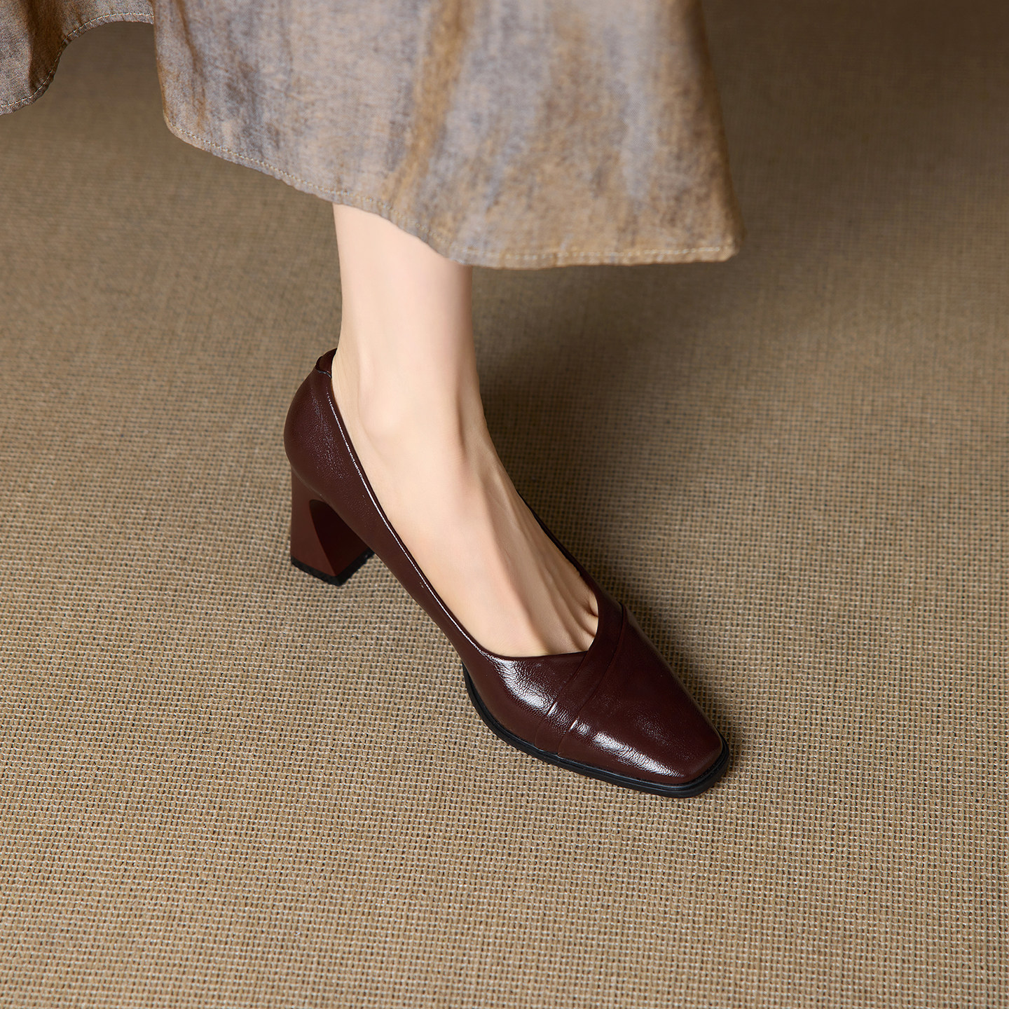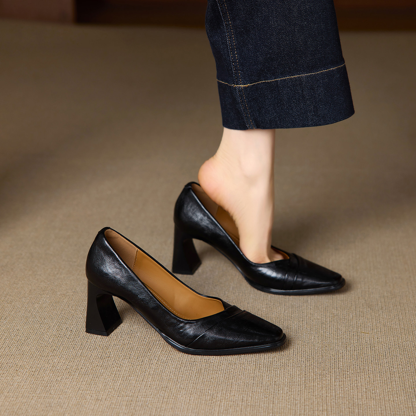 法式复古羊皮方头粗跟单鞋女软皮浅口通勤气质百搭不累脚高跟鞋