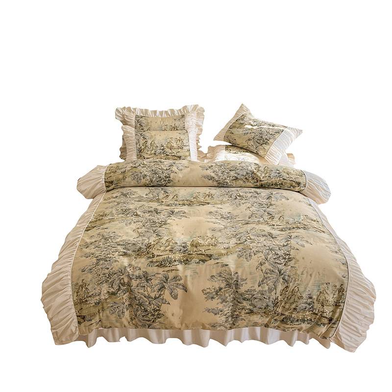 全棉法式荷叶花边复古四件套霍华德庄园纯棉床裙公主风古墨水彩画