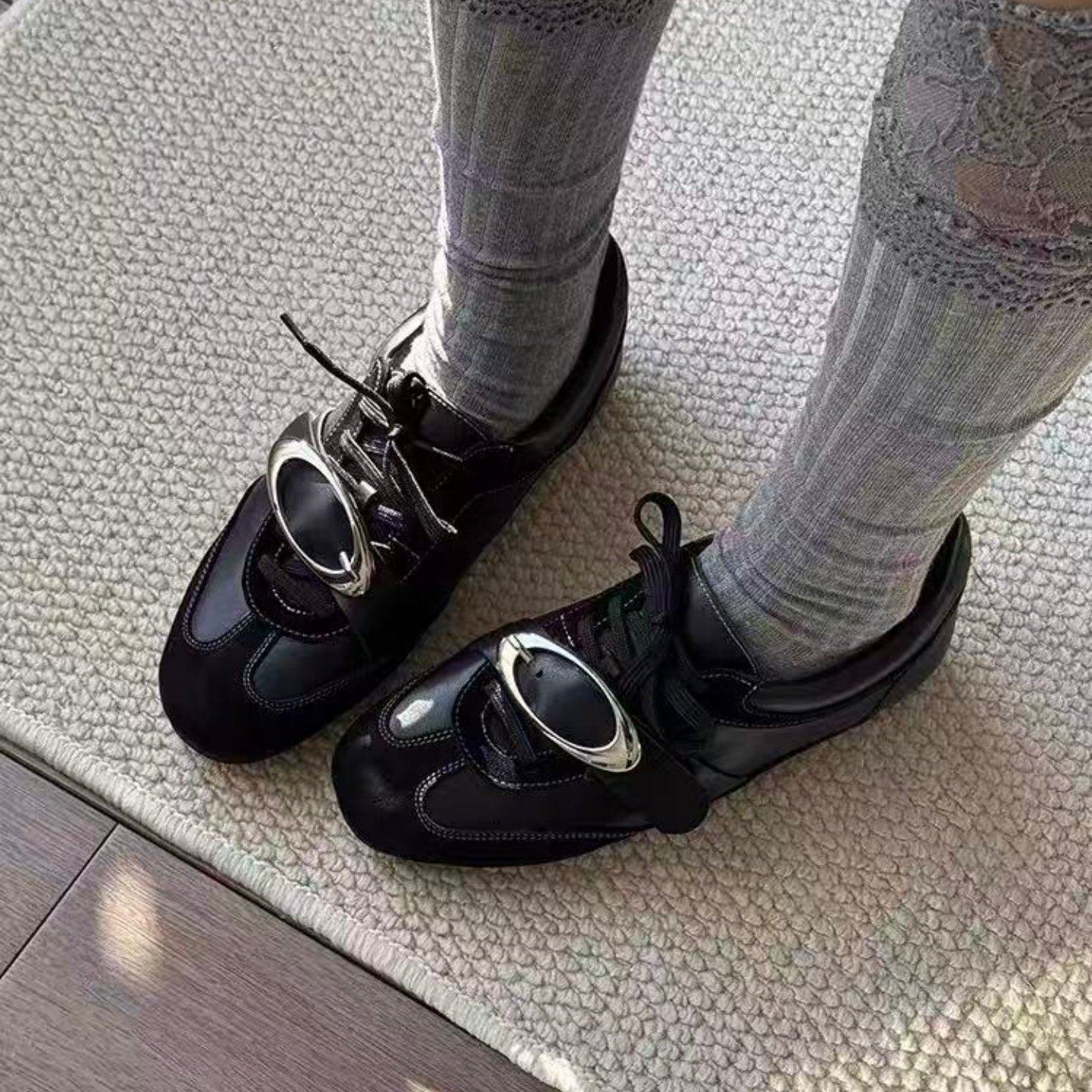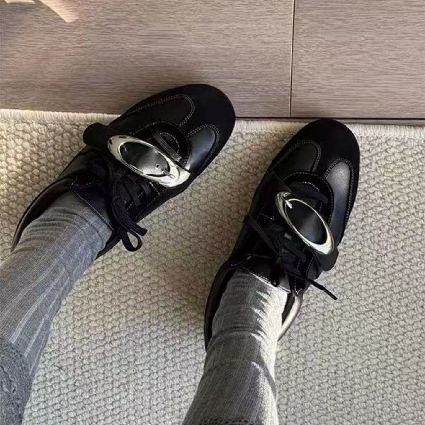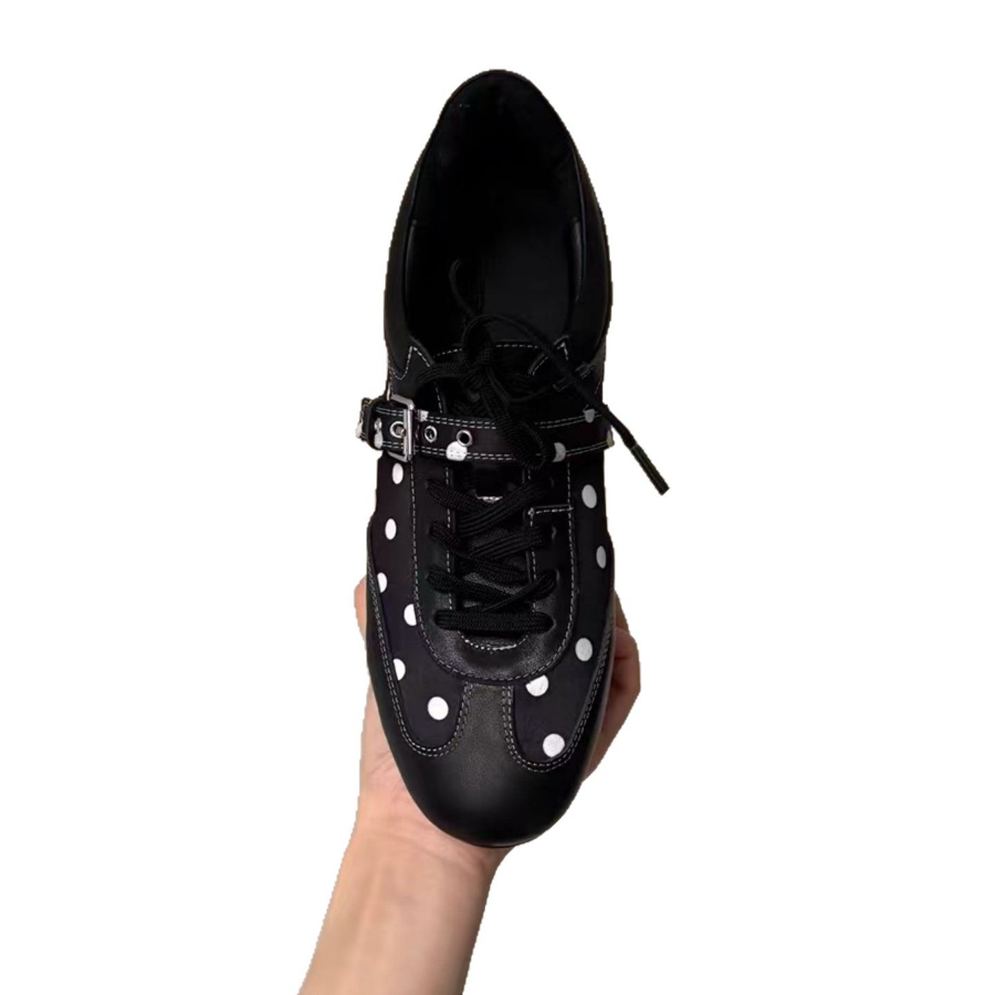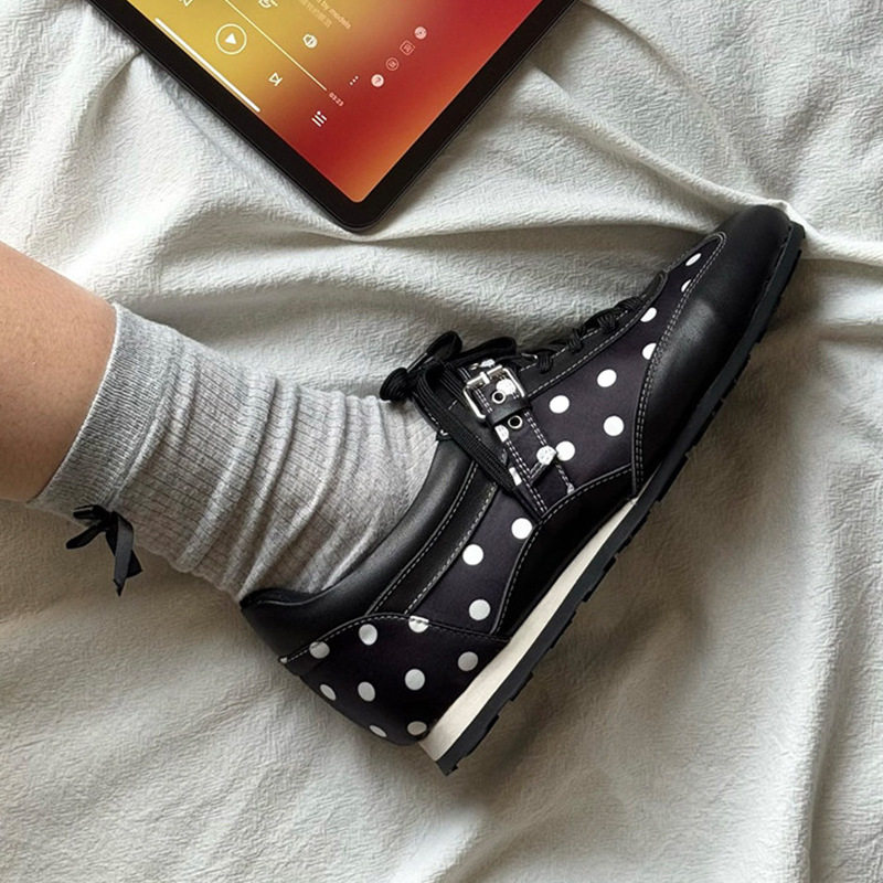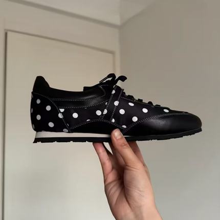 牛皮版~内增高黑色波点系带休闲德训鞋女春季阿甘鞋运动板鞋单鞋
