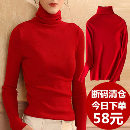 秋红色羊绒冬高领毛衣女网红紧身堆堆领打底衫修身羊毛针织衫薄款