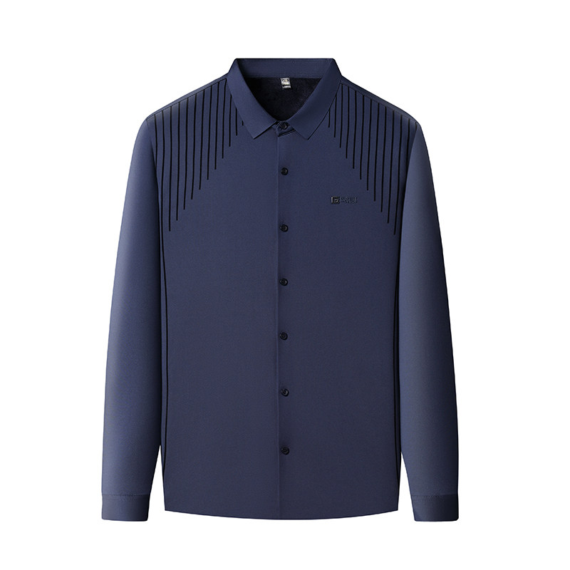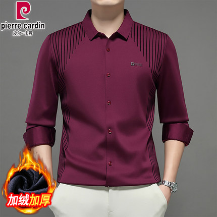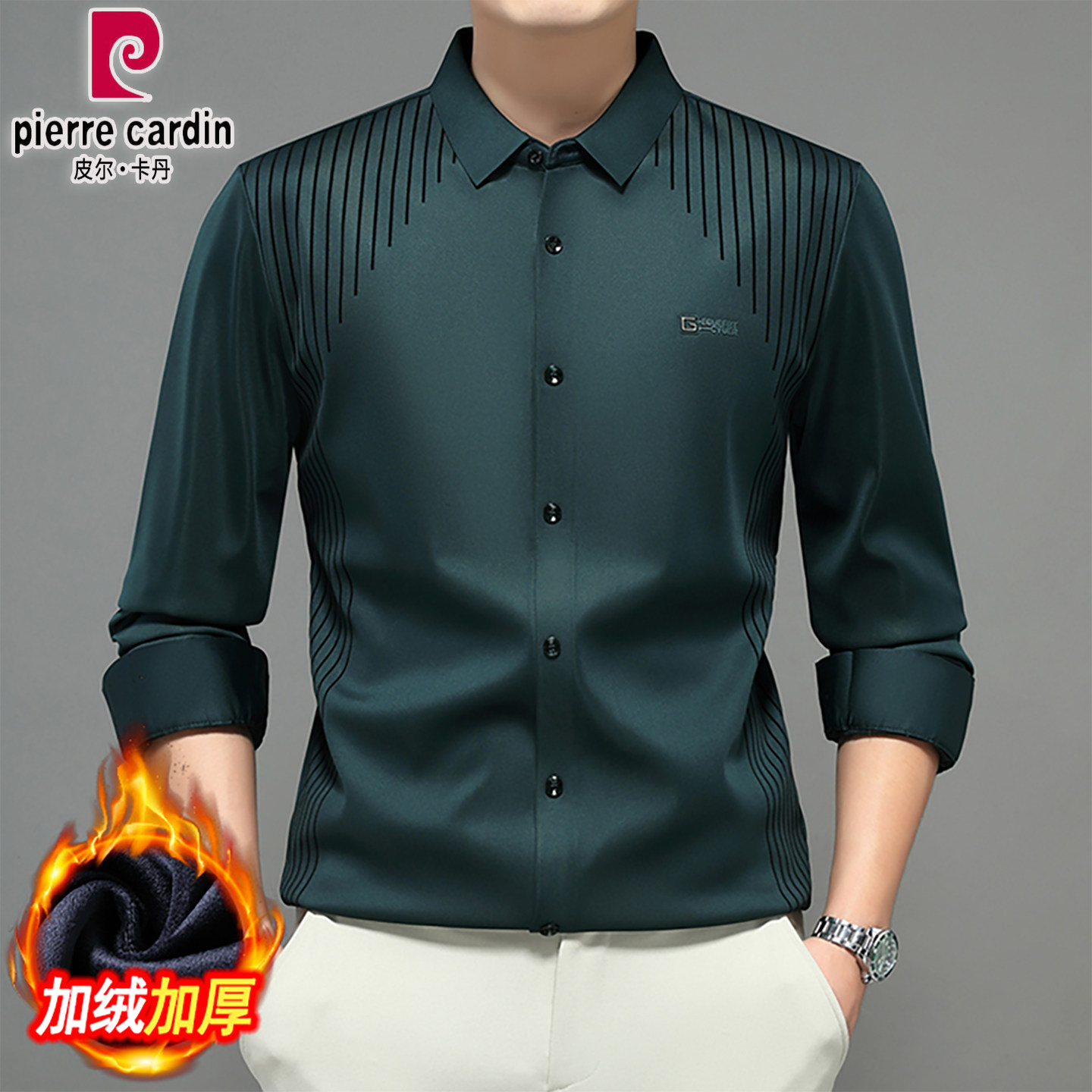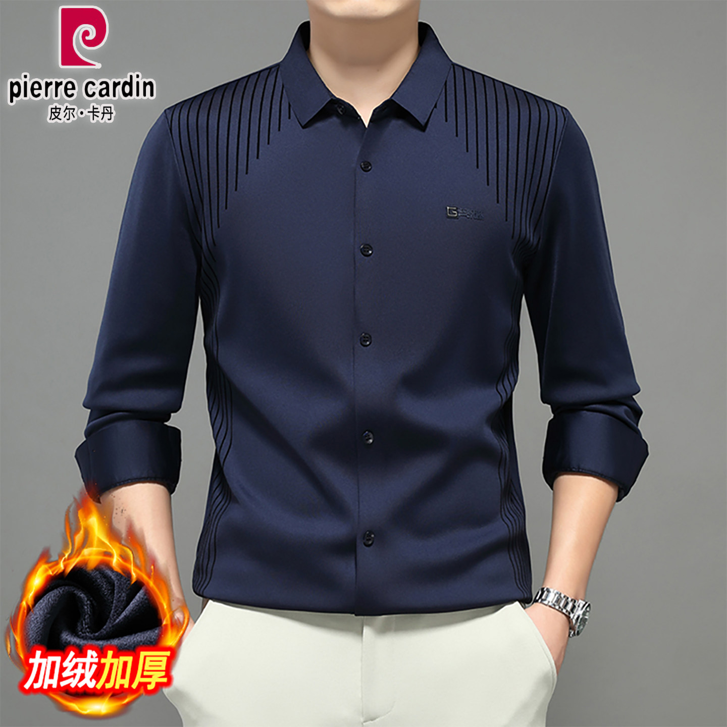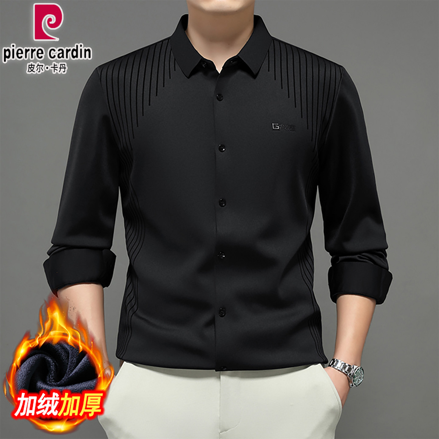 皮尔卡丹秋冬新款中年男士长袖衬衫加绒加厚翻领保暖免烫抗皱衬衣