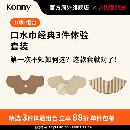 Konny口水巾经典3件体验套装 360度可旋转花瓣滚边双面双色口水巾