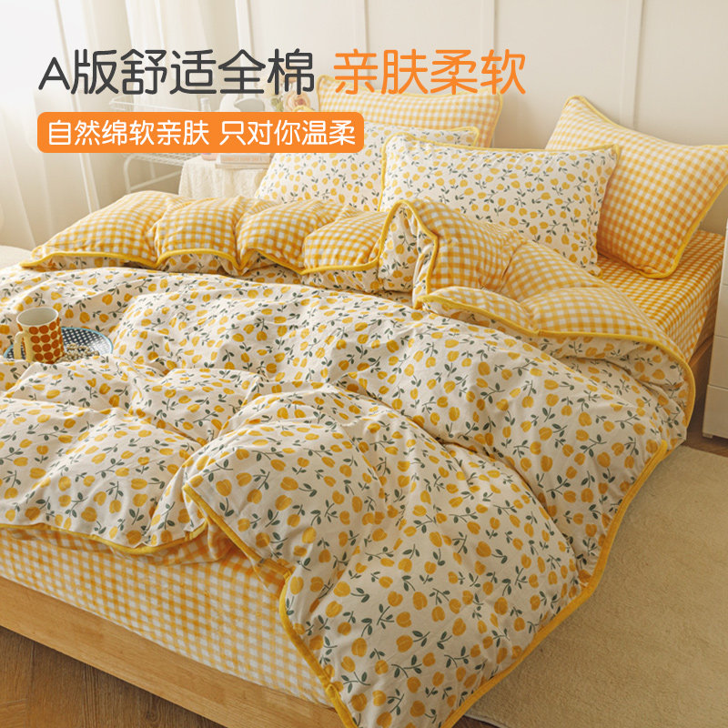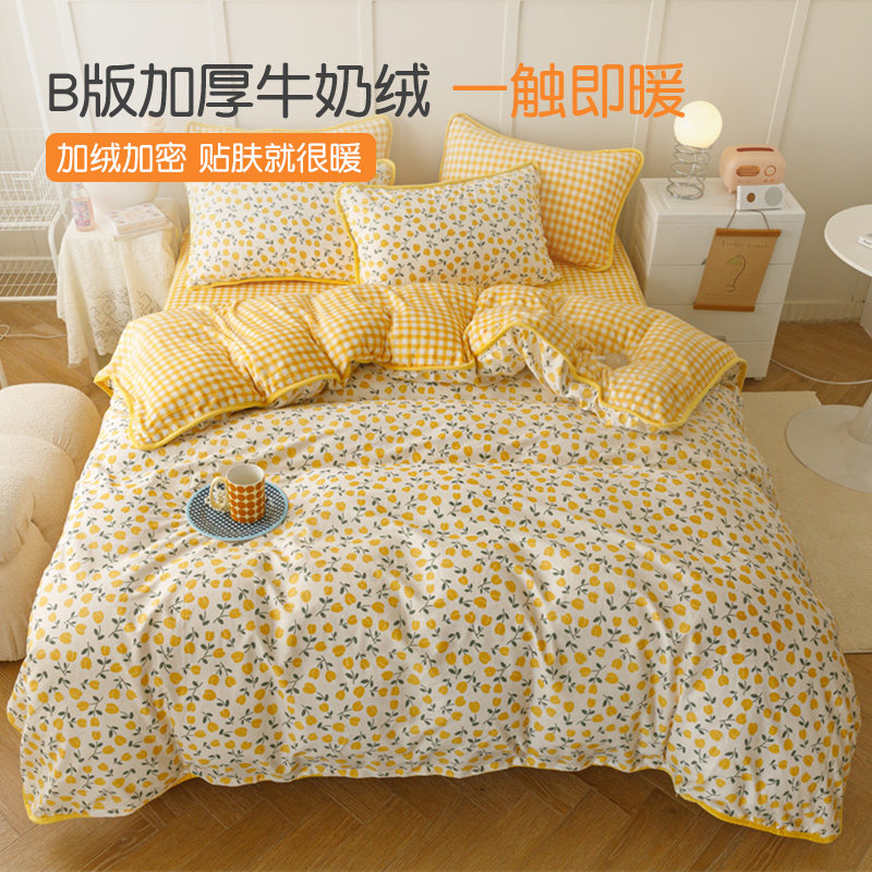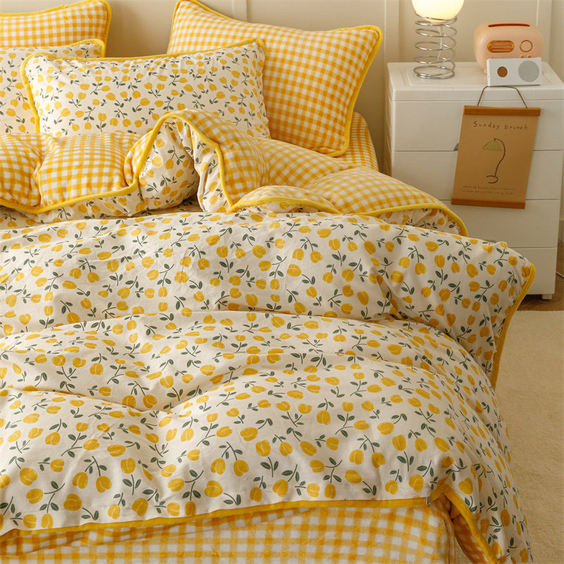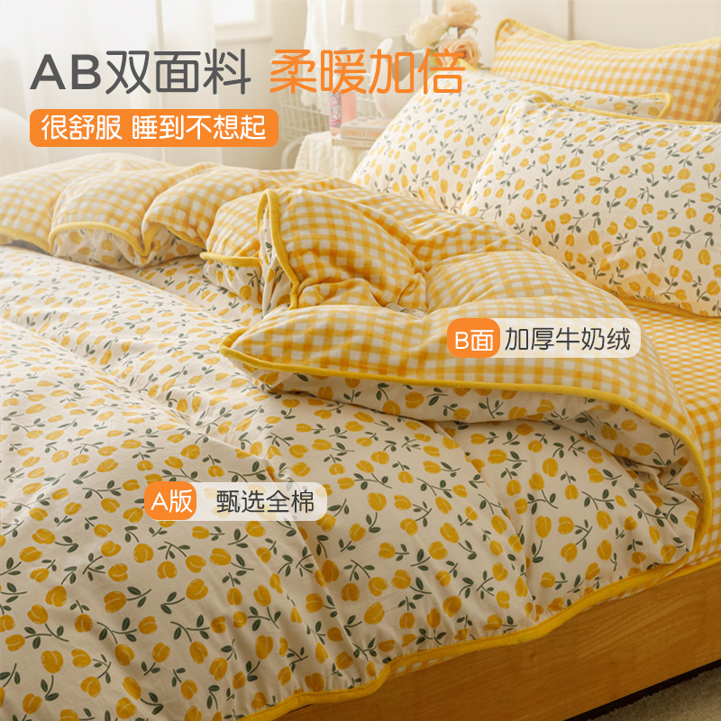冬季牛奶珊瑚绒被套ab面一面棉一面绒四件套单面绒黄色碎花被罩女