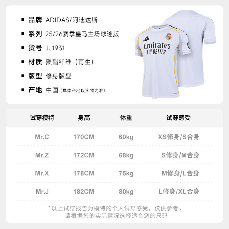 ADIDAS皇马主场球衣 阿迪达斯球迷版25/26赛季西甲短袖印号JJ1931