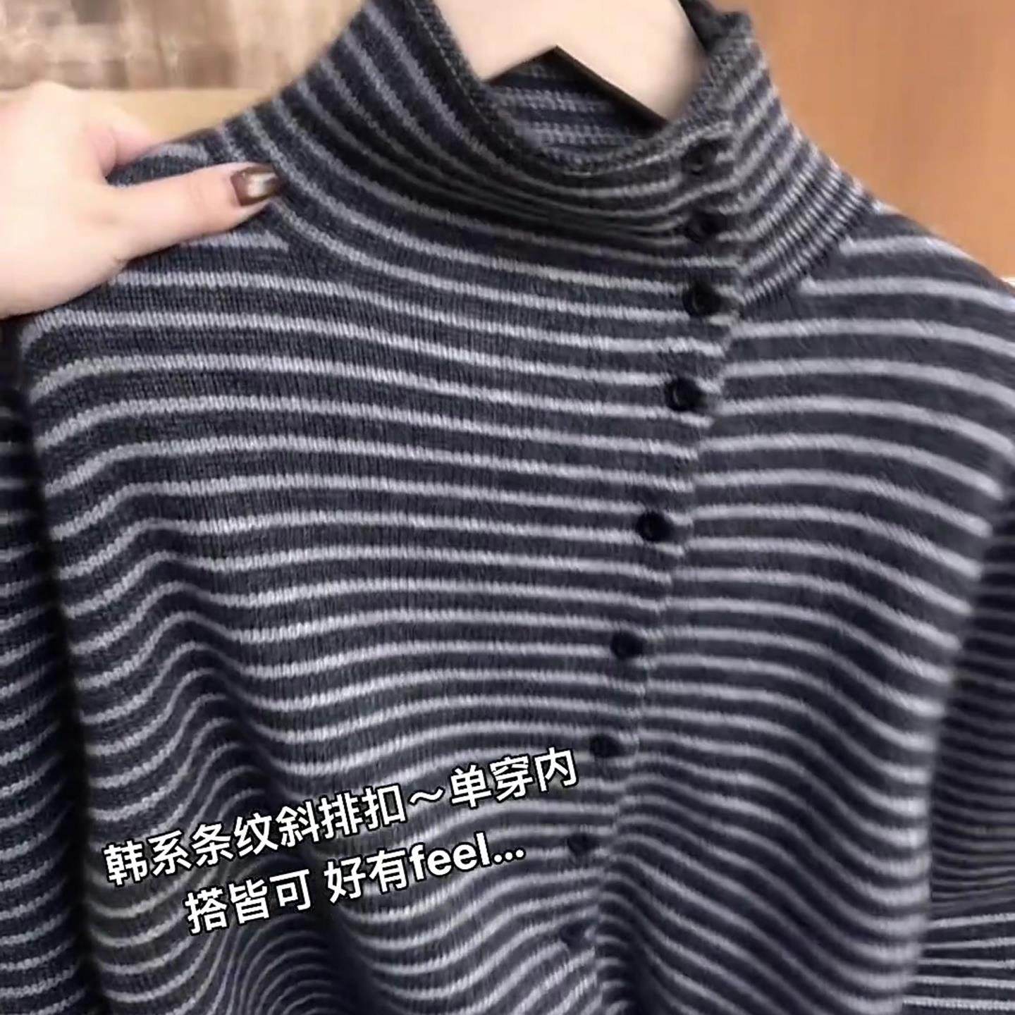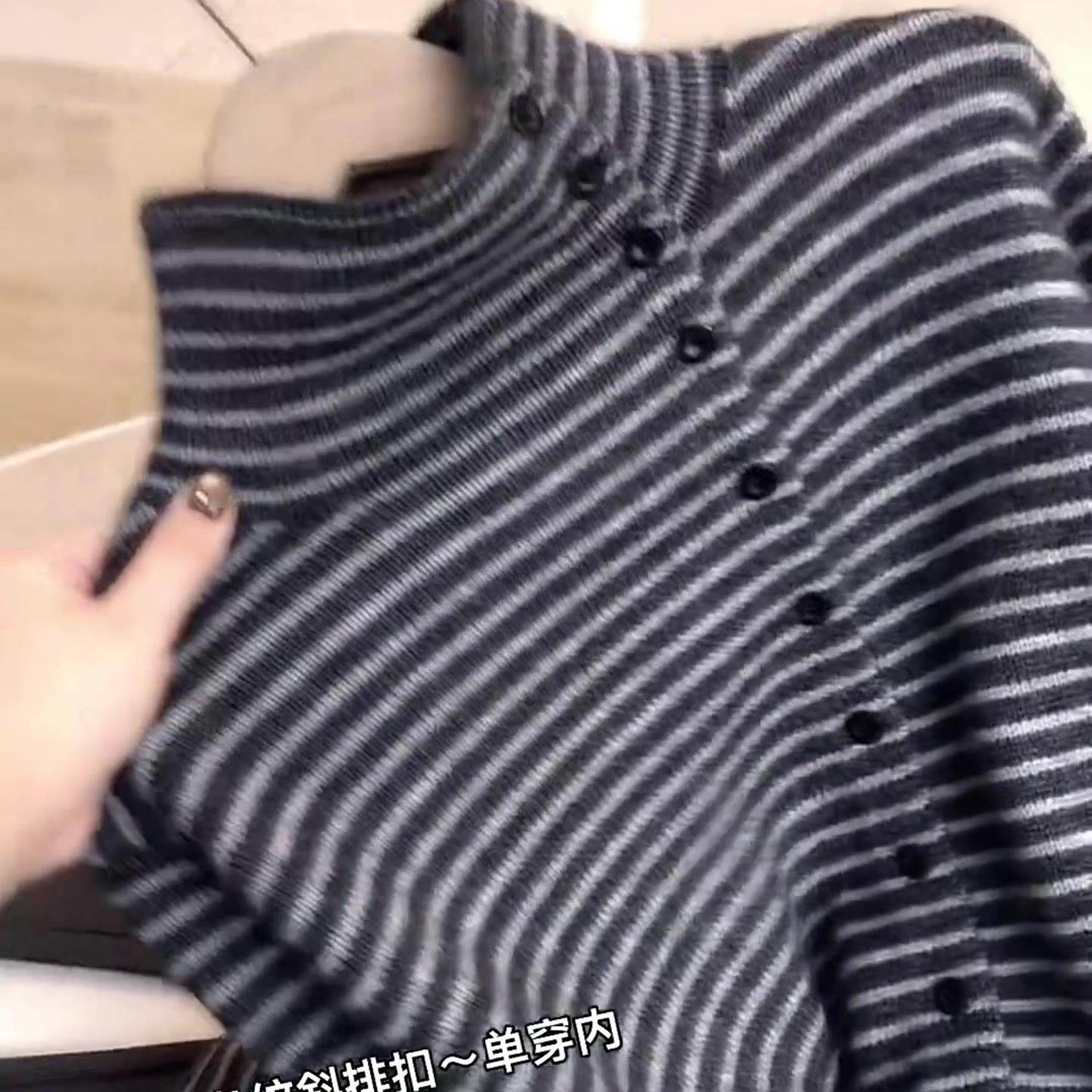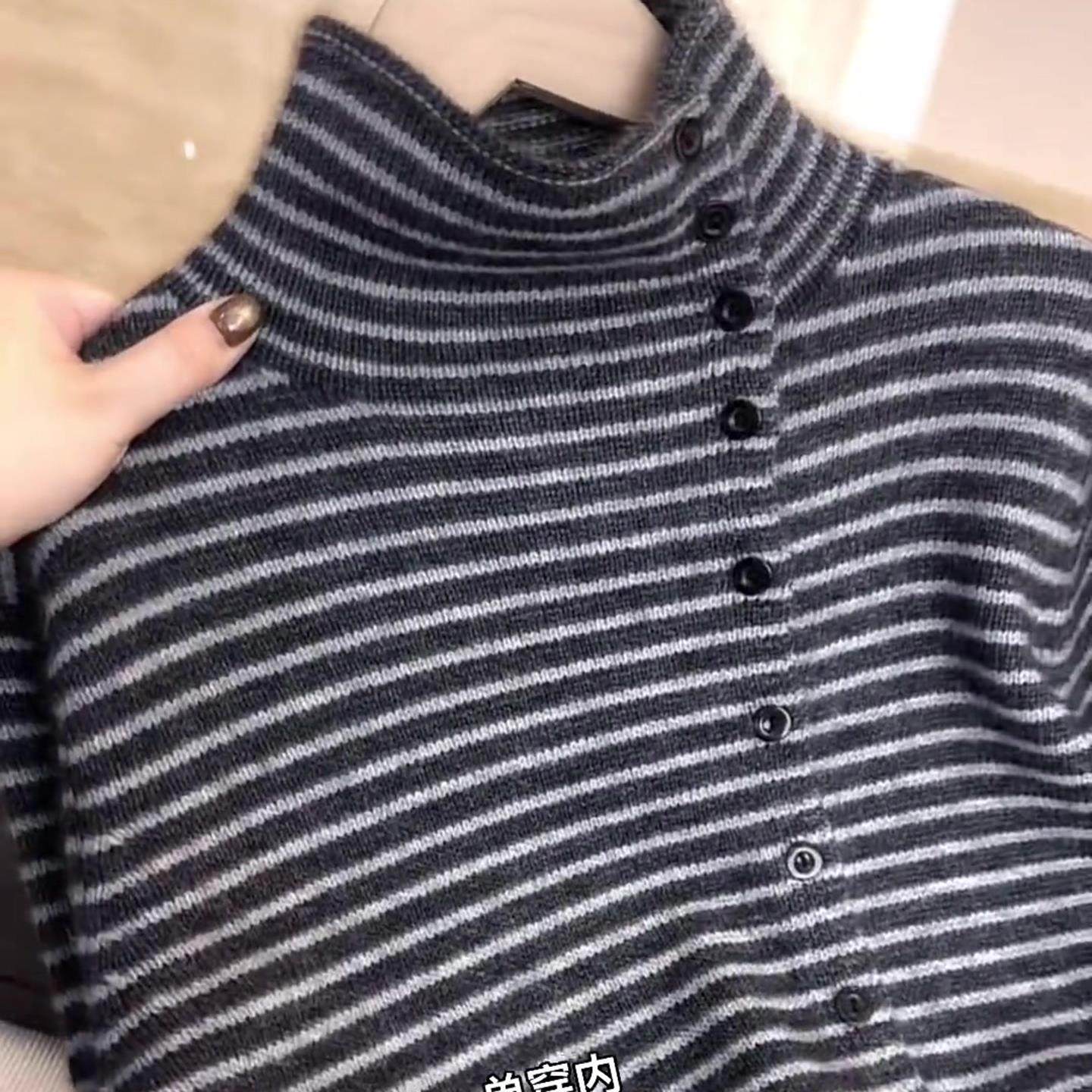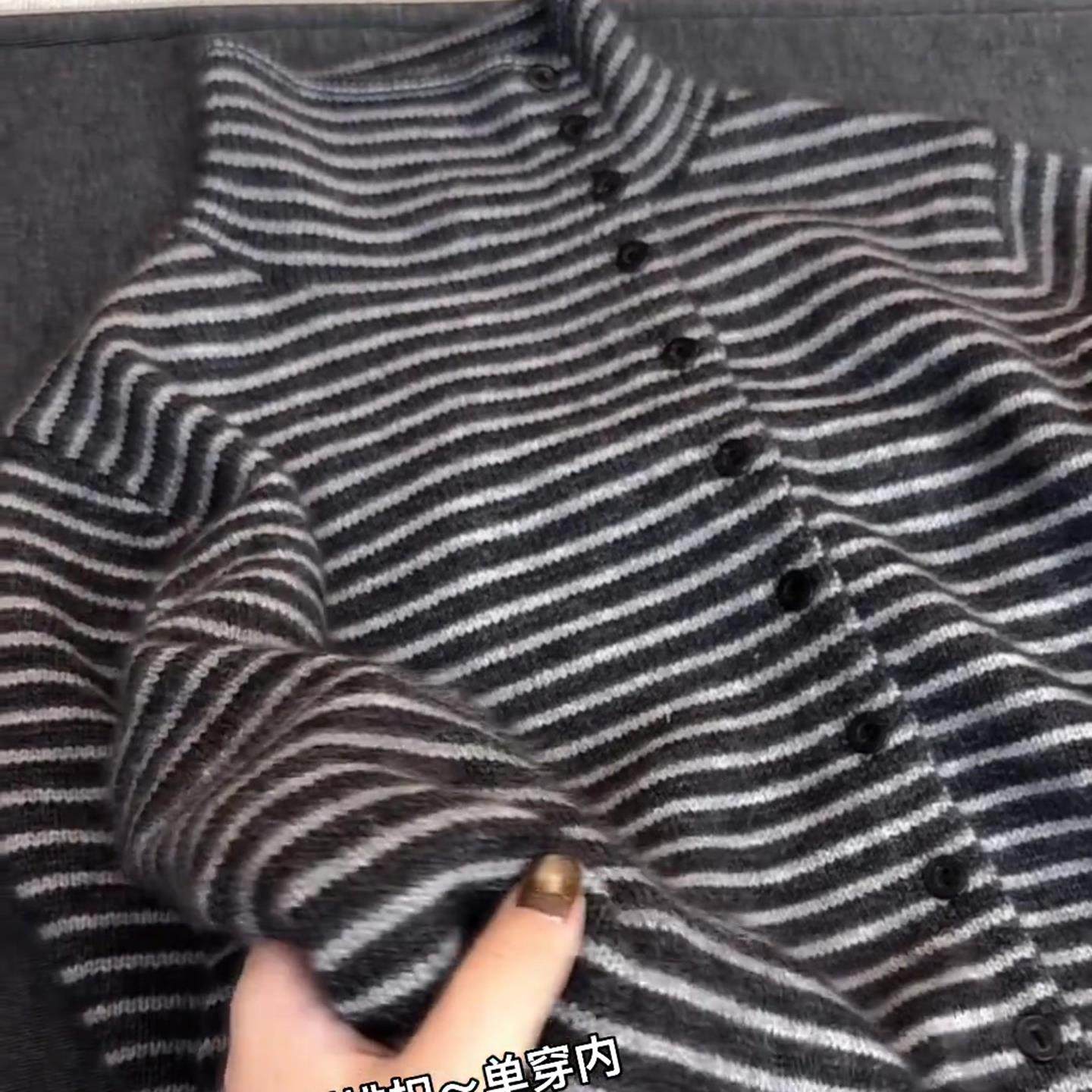 2025秋冬法式深灰色条纹高领针织开衫女侧扣显瘦气质毛衣洋气外套