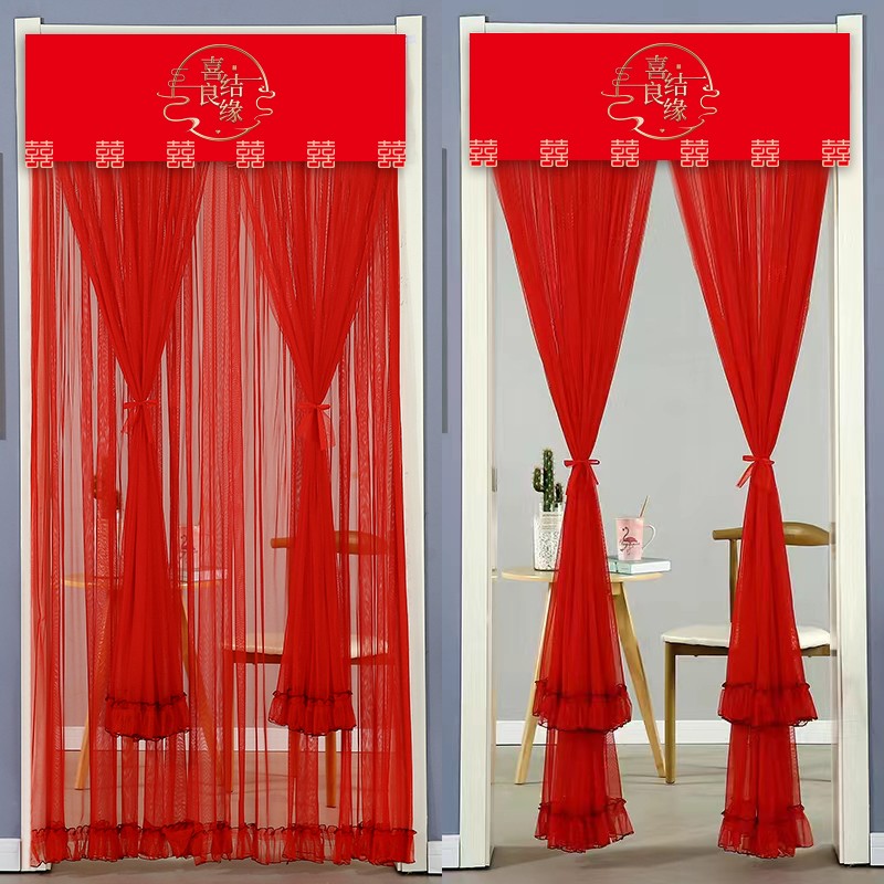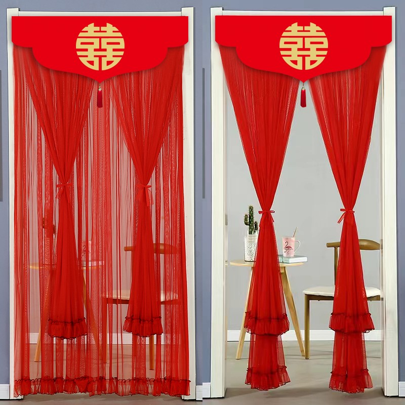 双层纱蕾丝防蚊门帘家用卧室结婚喜字喜庆大红色门帘魔术贴免打孔