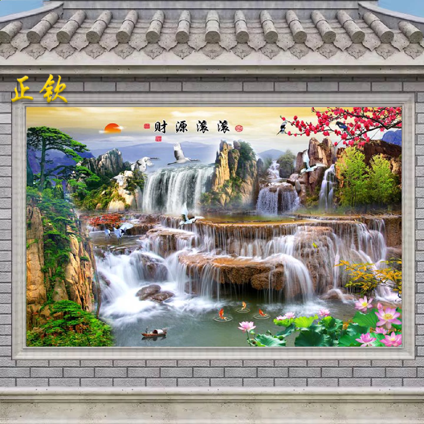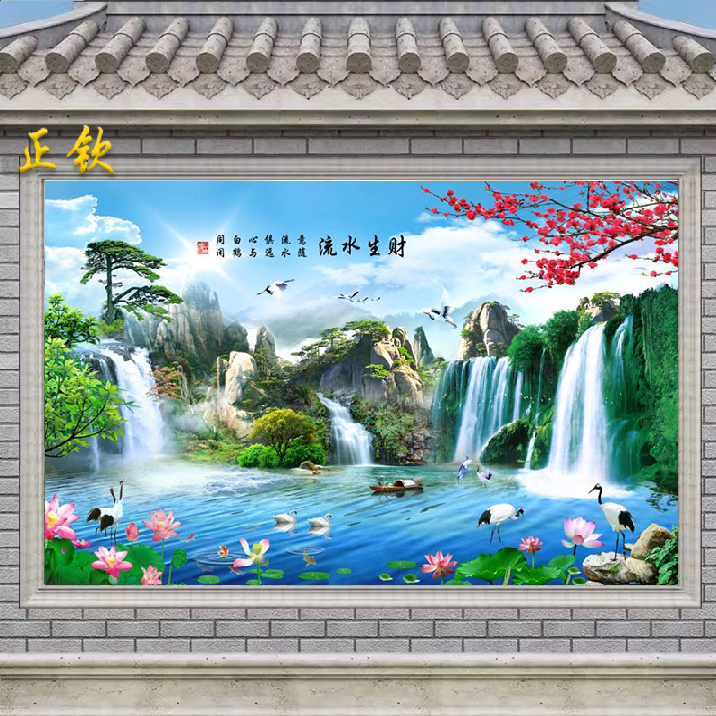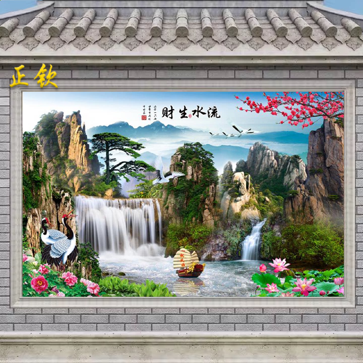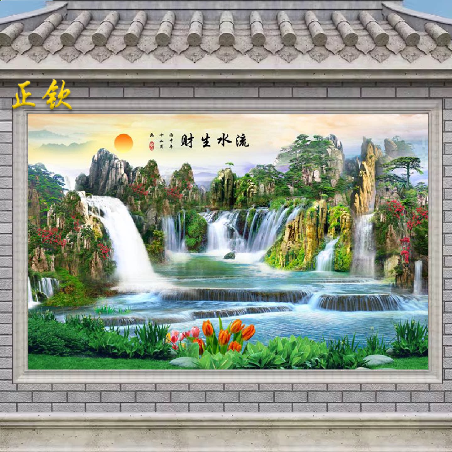 中式山水画瓷砖背景墙庭院影壁墙农村室外迎门墙照壁墙砖流水生财