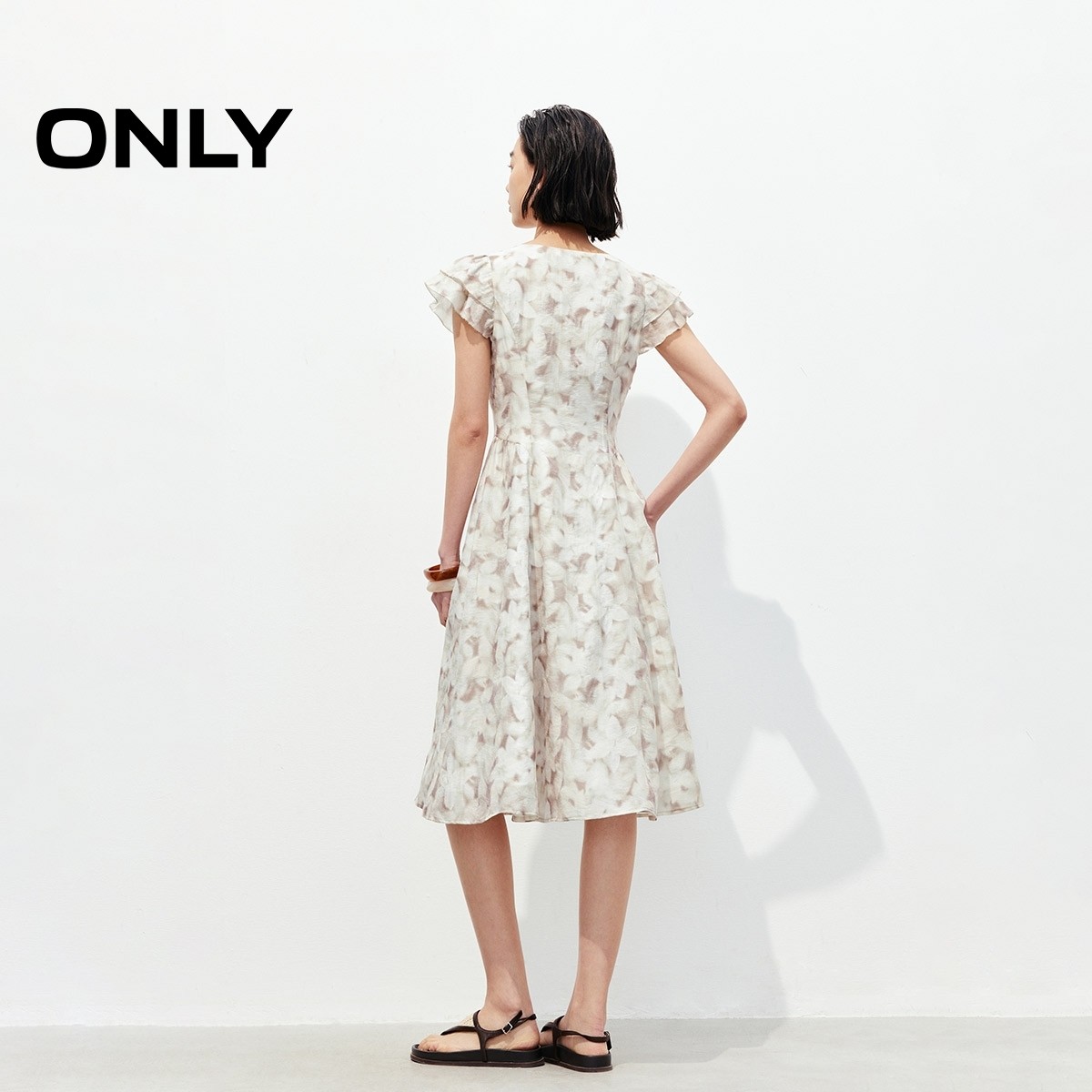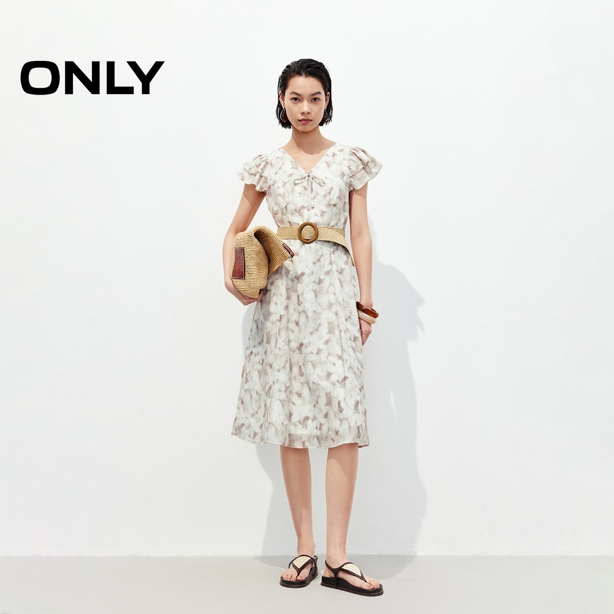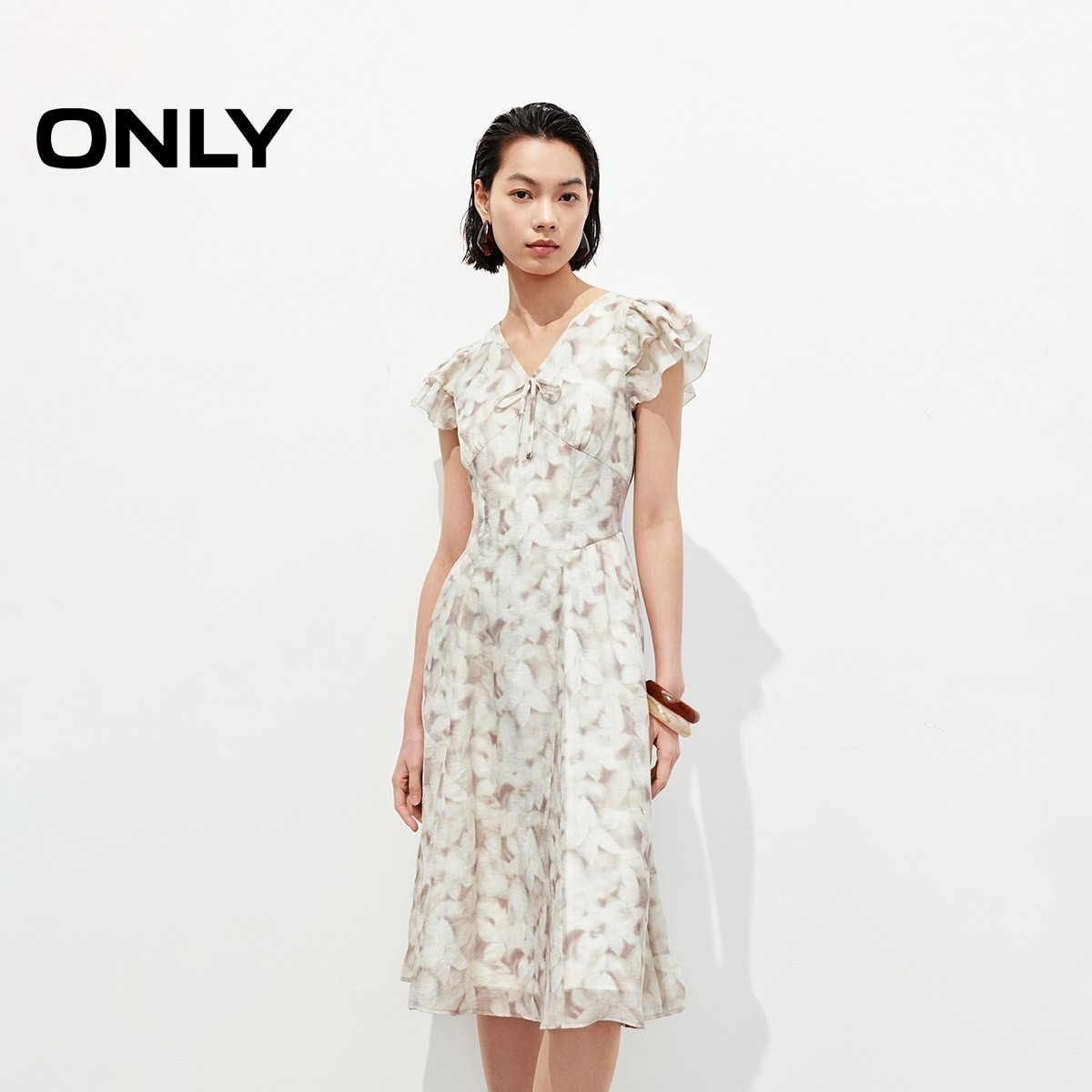 ONLY2025夏季新款修饰肩颈线条法式荷叶袖淡雅印花V领连衣裙女