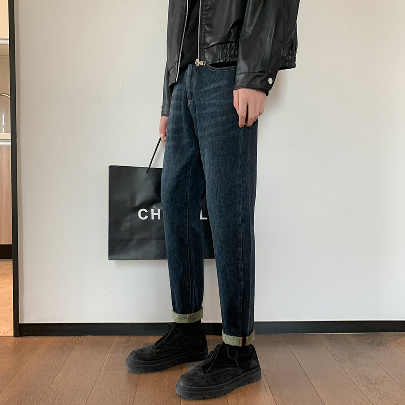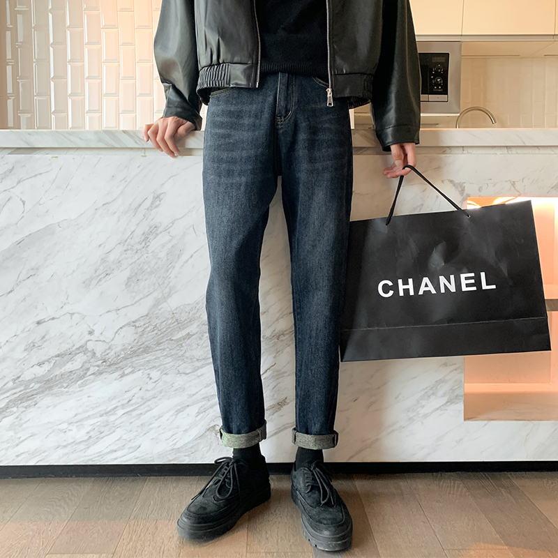 酷帅穿搭高级感裤子男秋冬季加厚深蓝色卷边牛仔裤修身小脚烟管裤