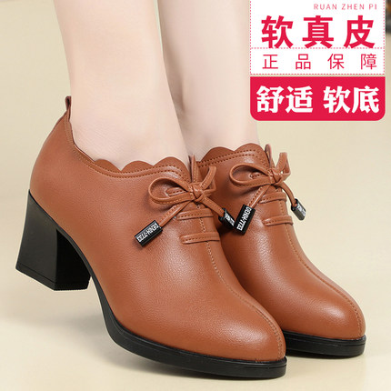 2025春秋新款真皮深口皮鞋女鞋中跟粗跟妈妈鞋时尚百搭韩版单鞋女