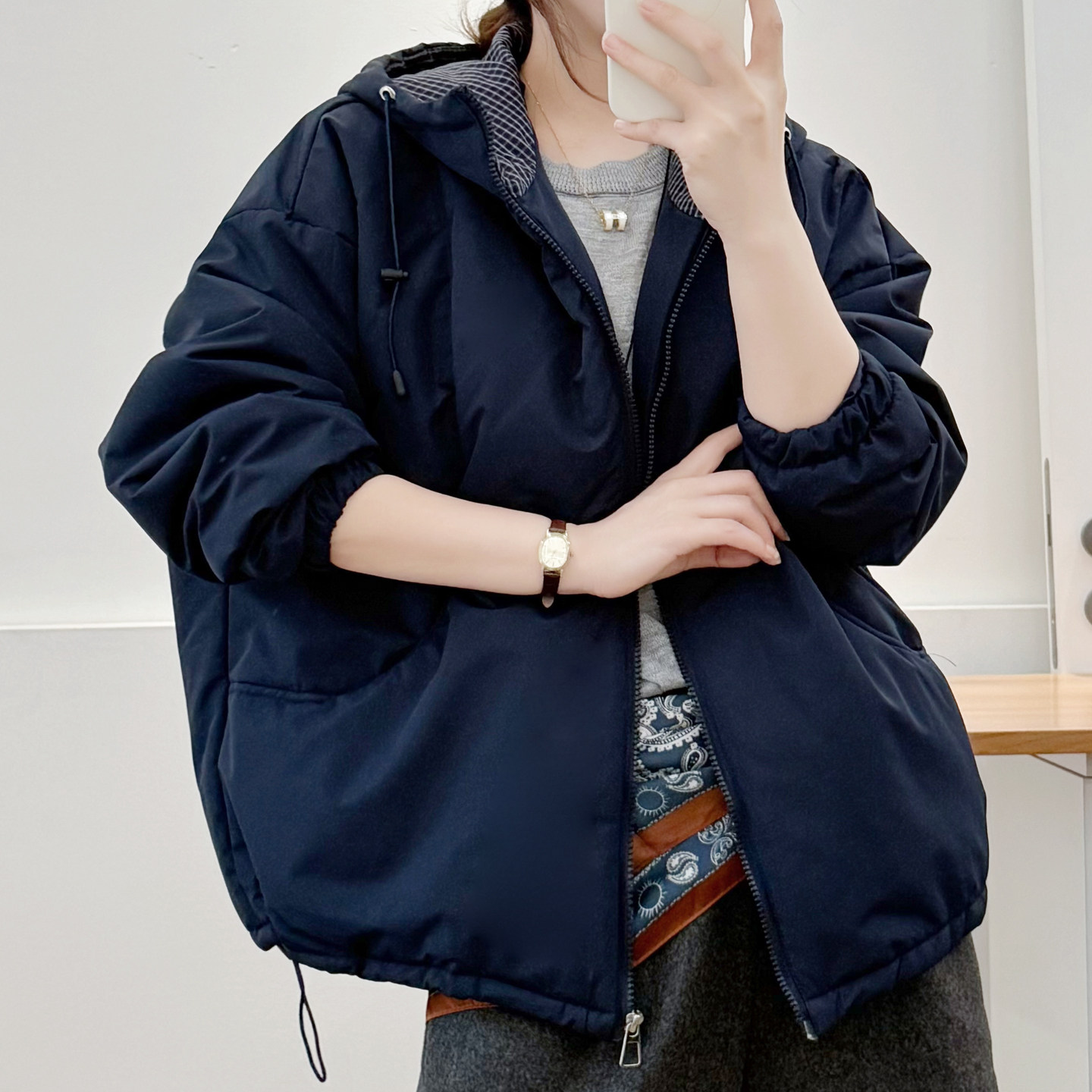 大码休闲连帽格子时尚保暖棉服女