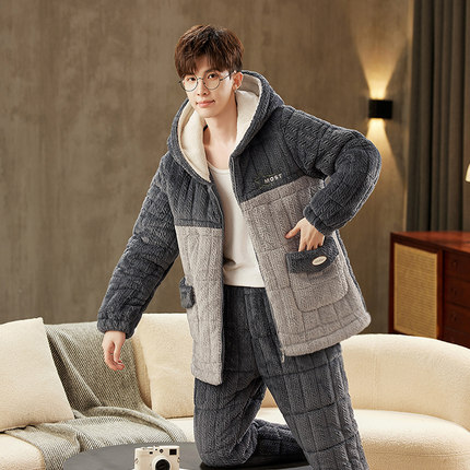 睡衣男冬季加厚加绒三层夹棉保暖珊瑚绒秋冬款男士拉链家居服套装