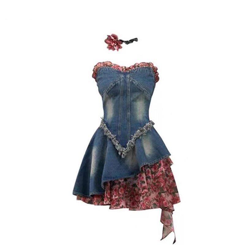 法式绝美甜辣妹田曦薇同款蓝色玫瑰抹胸牛仔连衣裙女夏季收腰显瘦