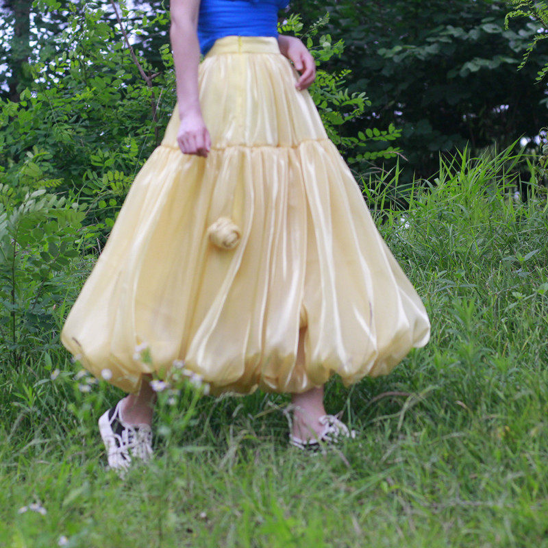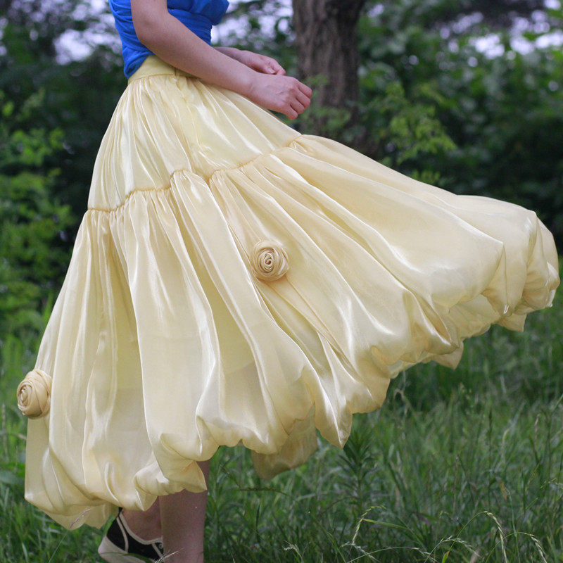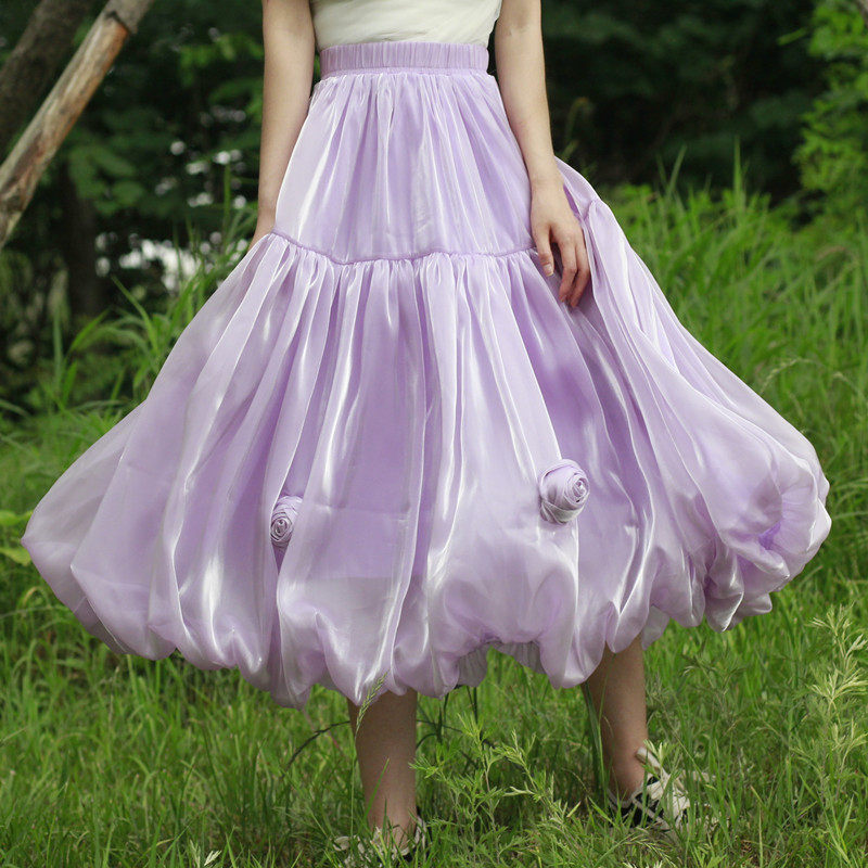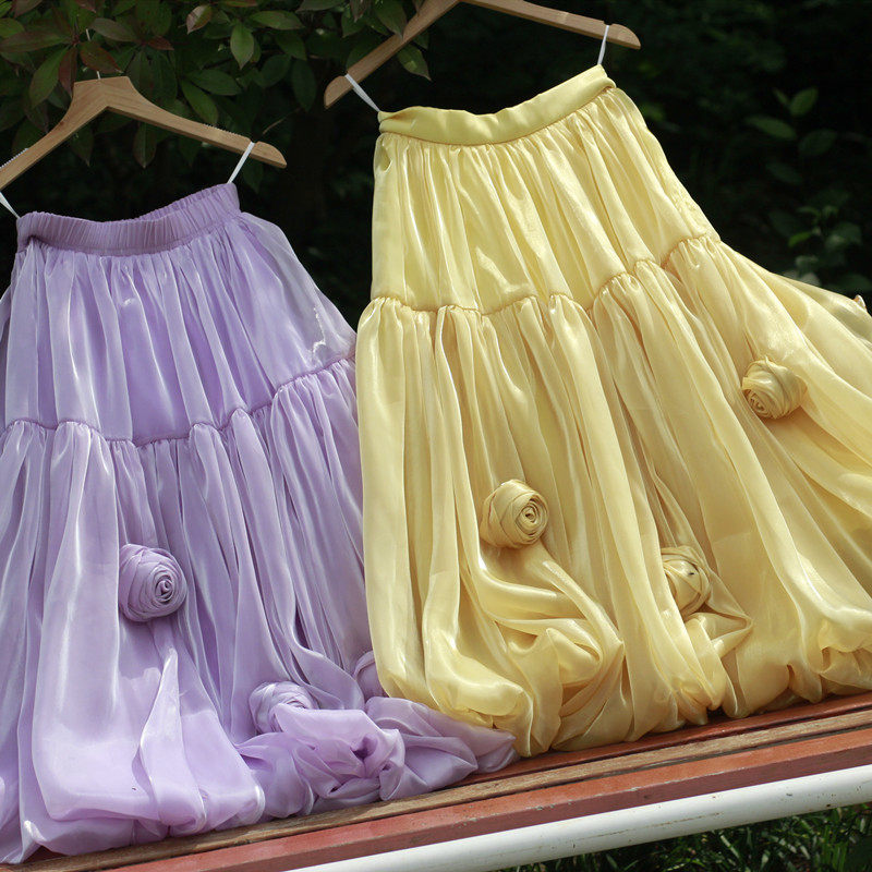 夏季新款流光纱花苞裙手工玫瑰花朵褶皱百搭显瘦大摆中长款半身裙