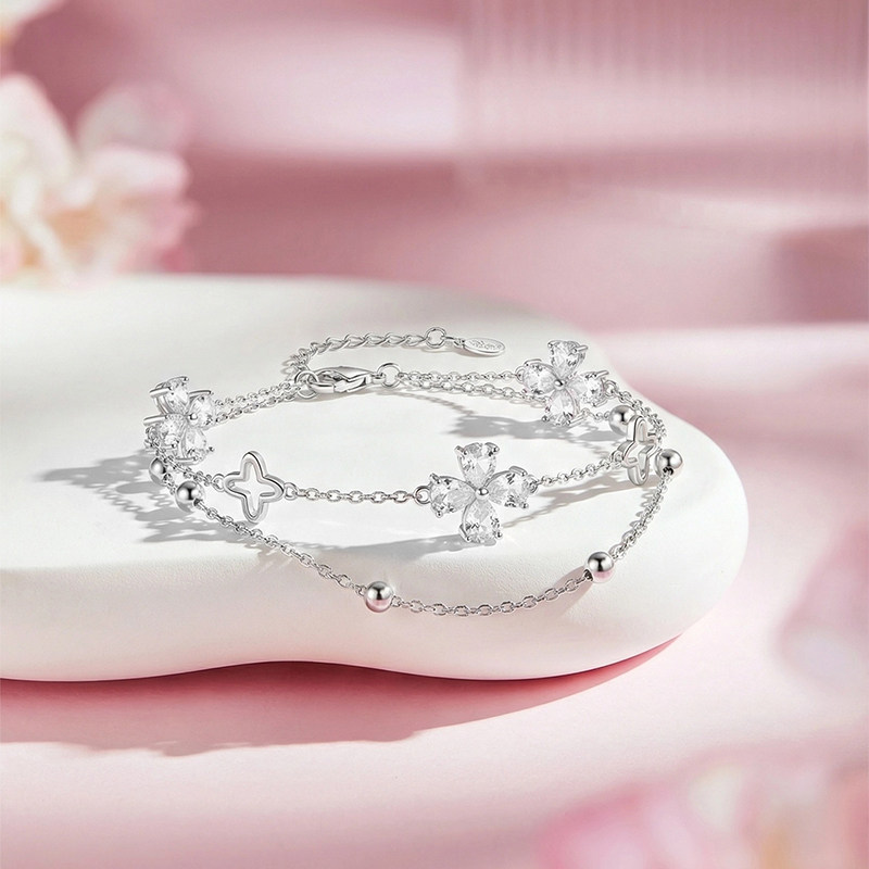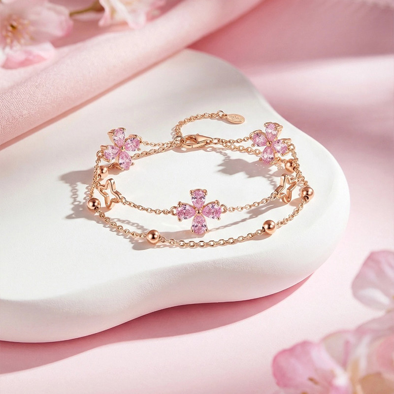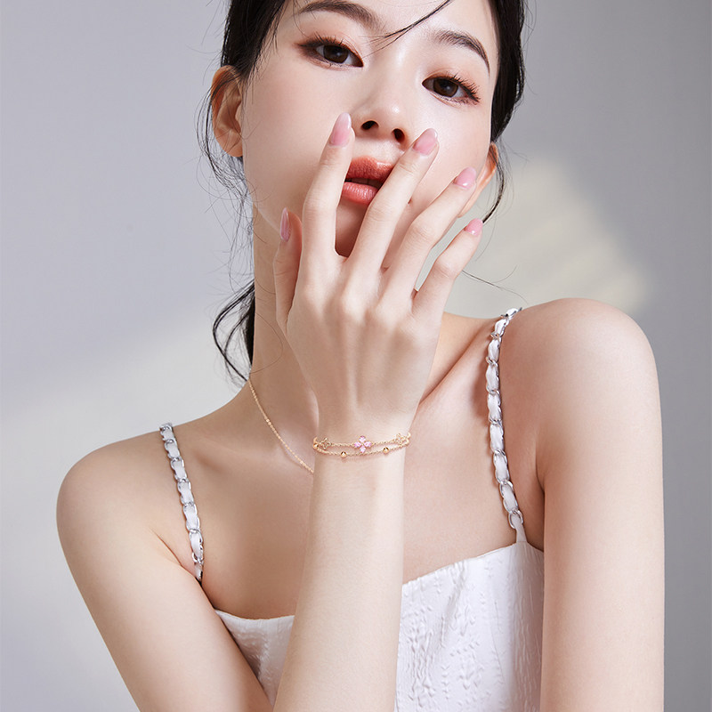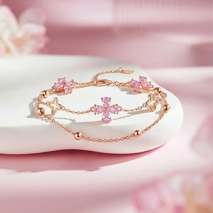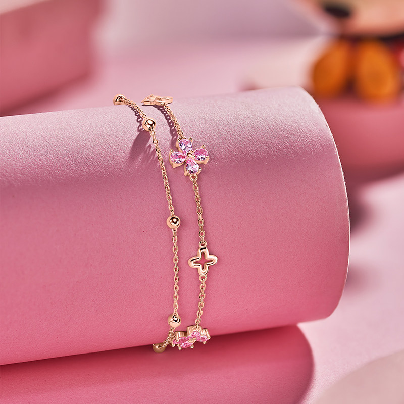 Disney迪士尼粉色四叶草花朵手链女玫瑰金链条手饰品