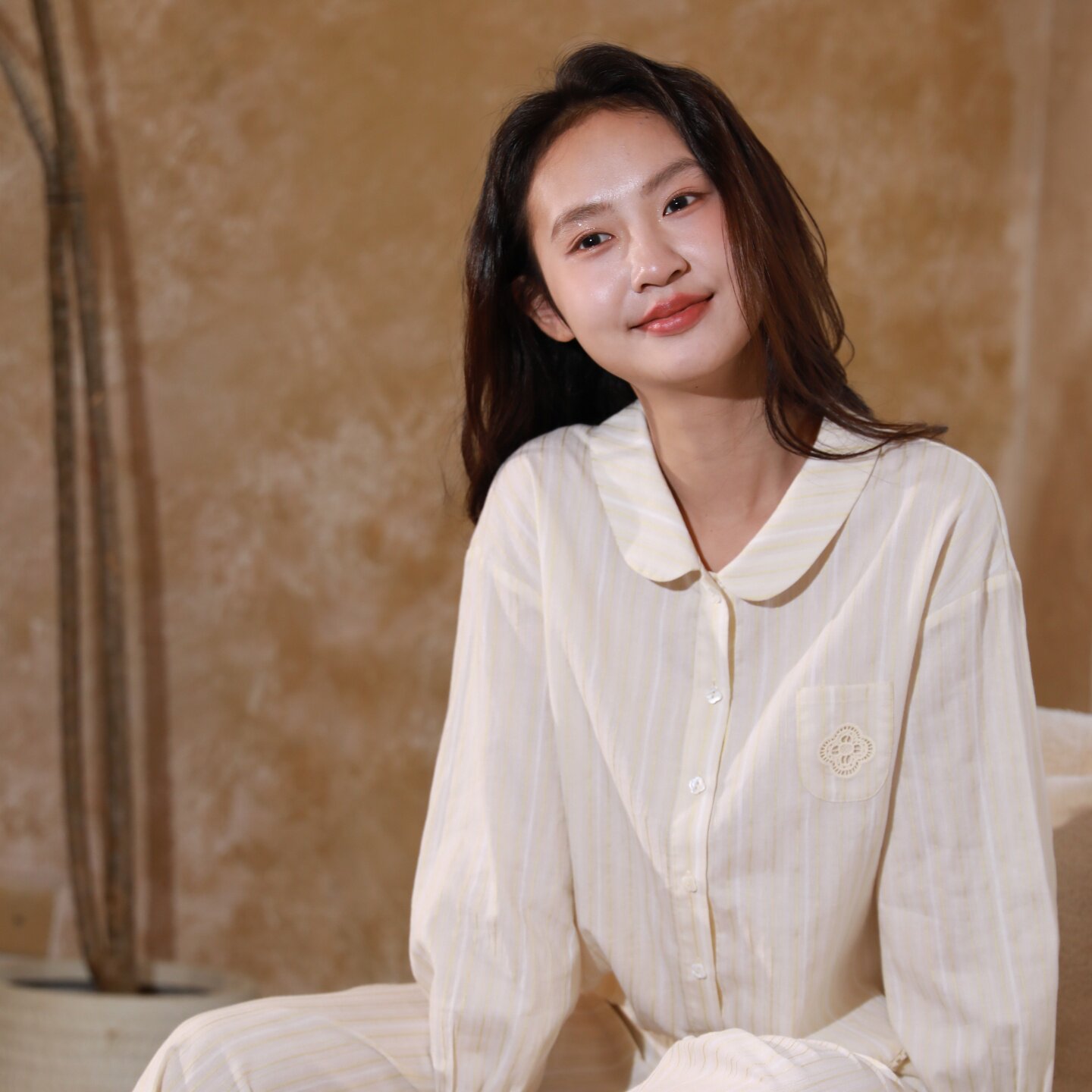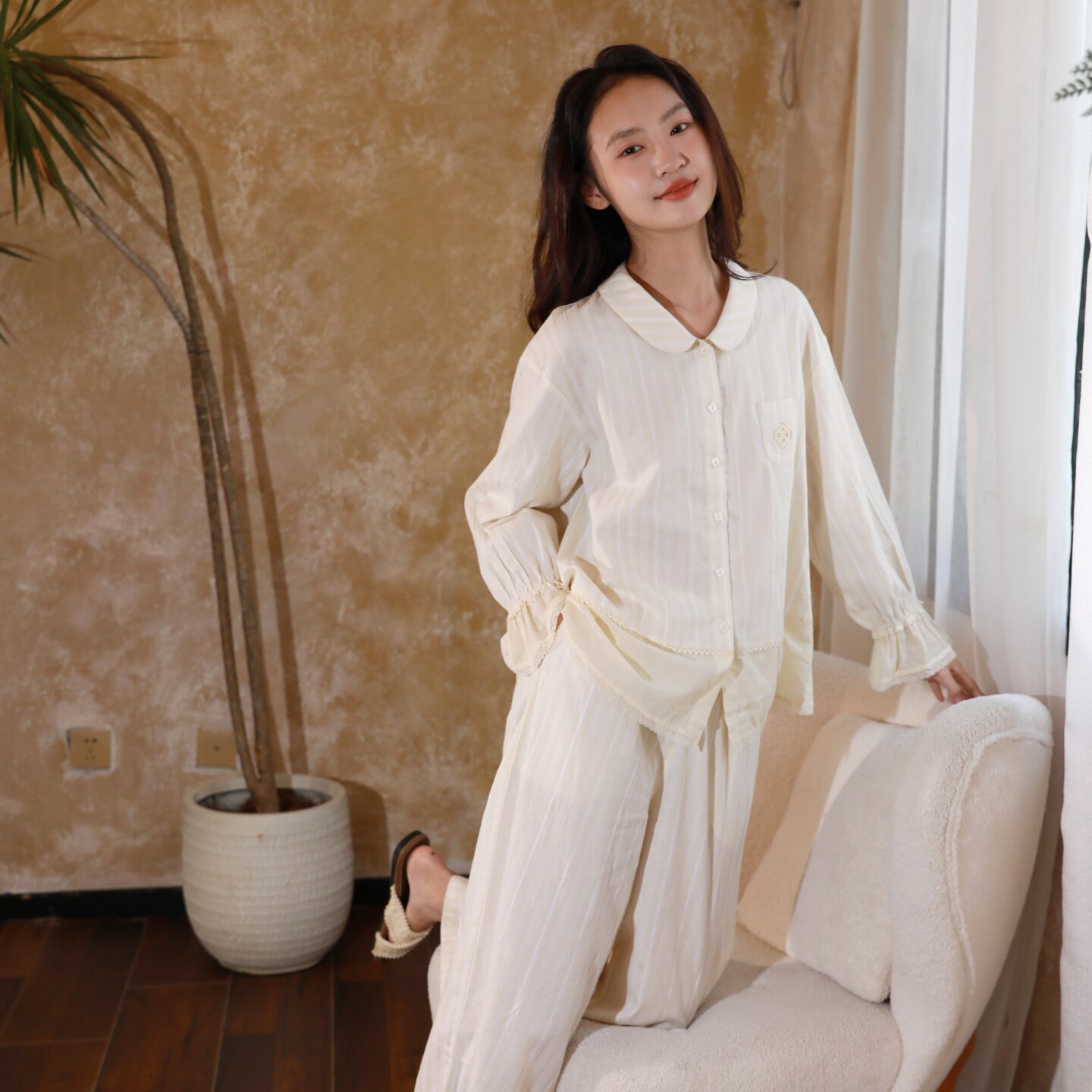 朵朵可可睡衣女2026春夏新款色织棉提花条纹花边长袖长裤家居服套