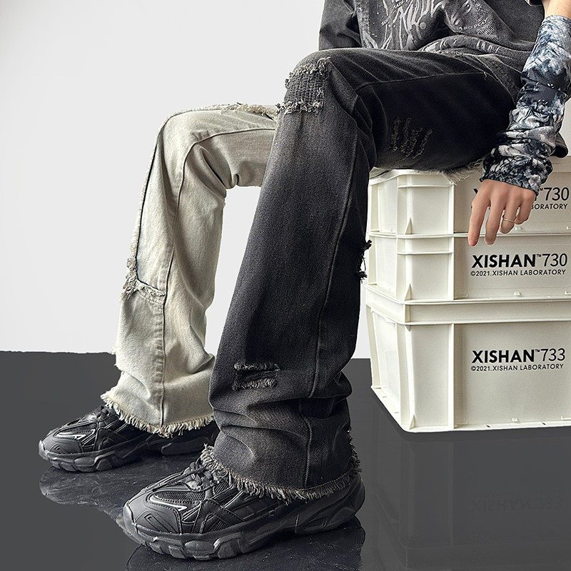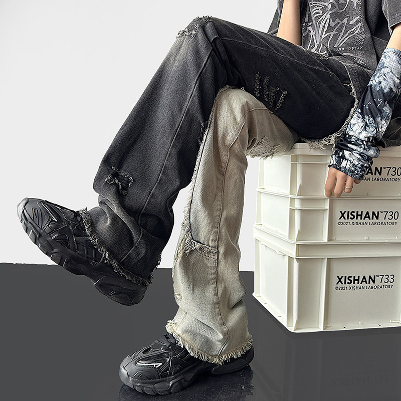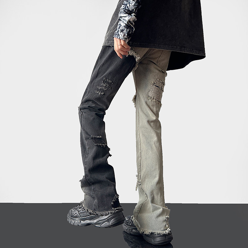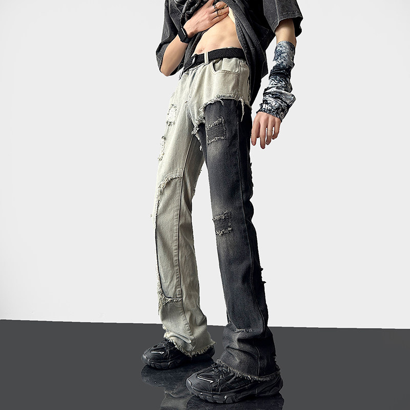 美式高街vibe裤子男款破洞拼接双色牛仔裤设计感修身直筒鸳鸯裤潮